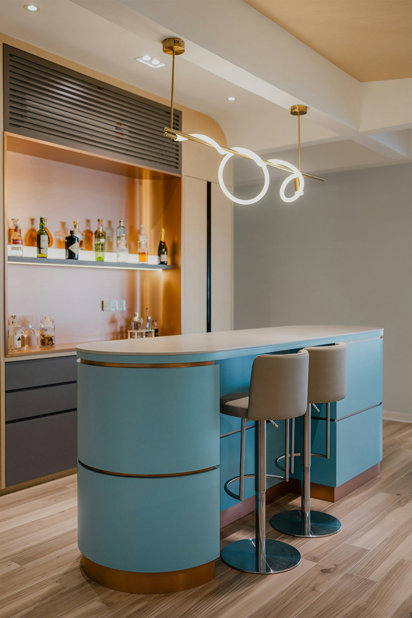 Argentium, another Dekton colour, was chosen for the top of the exclusive bar in shades of sky blue. A neutral shade of grey, typical of lime plastering, which creates a visual texture that adds movement and depth to the whole.