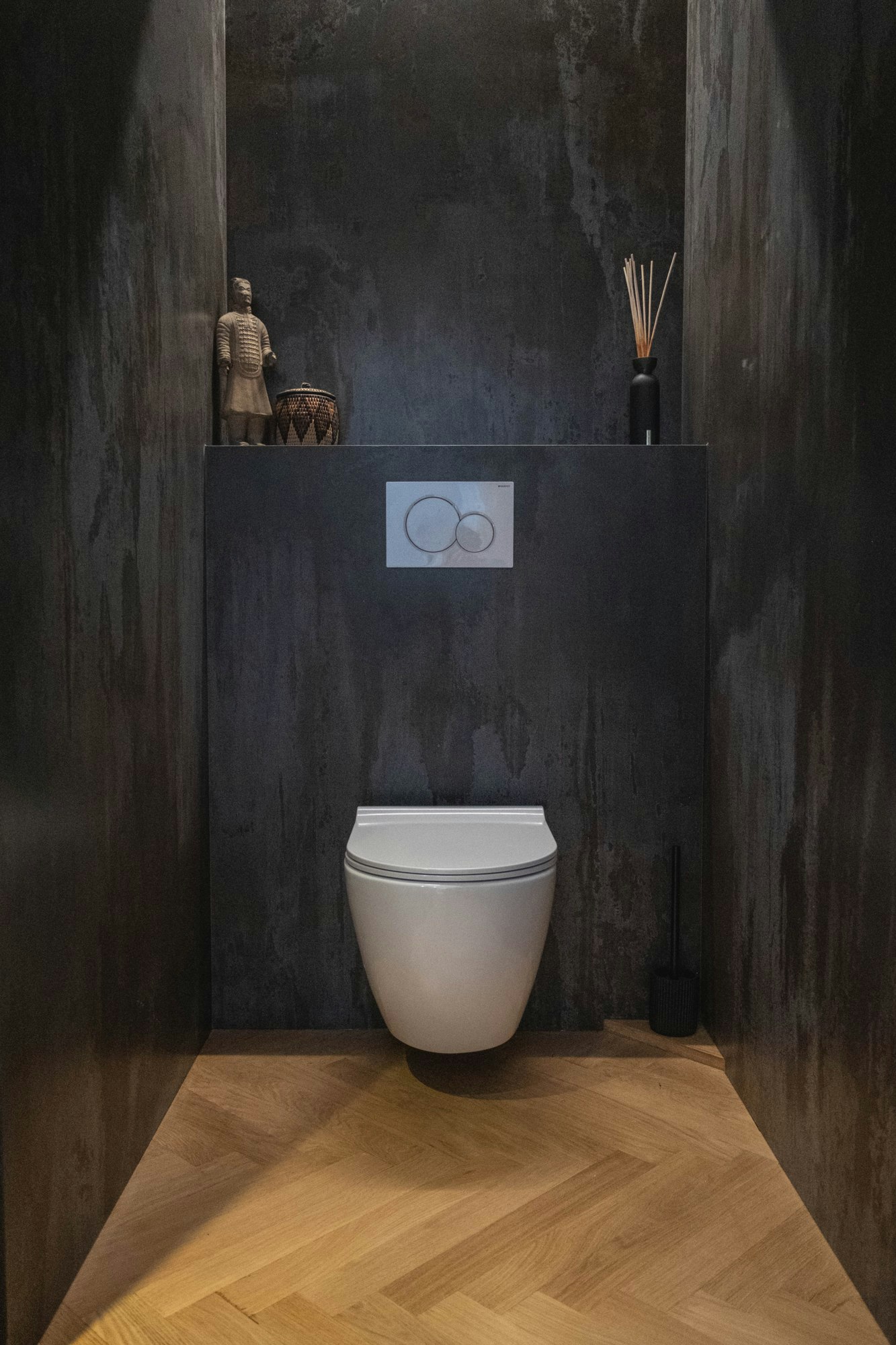 The toilet room, clad in Dekton Trilium, offers a radically different atmosphere: deep, volcanic and oxidized tones envelop the space with near-theatrical intensity. Arc Intérieur has created a true immersive alcove here, where vertical lighting emphasizes the depth and metallic nuances of Dekton Trilium. In this compact volume, material becomes atmosphere, transforming a functional space into a striking architectural moment.