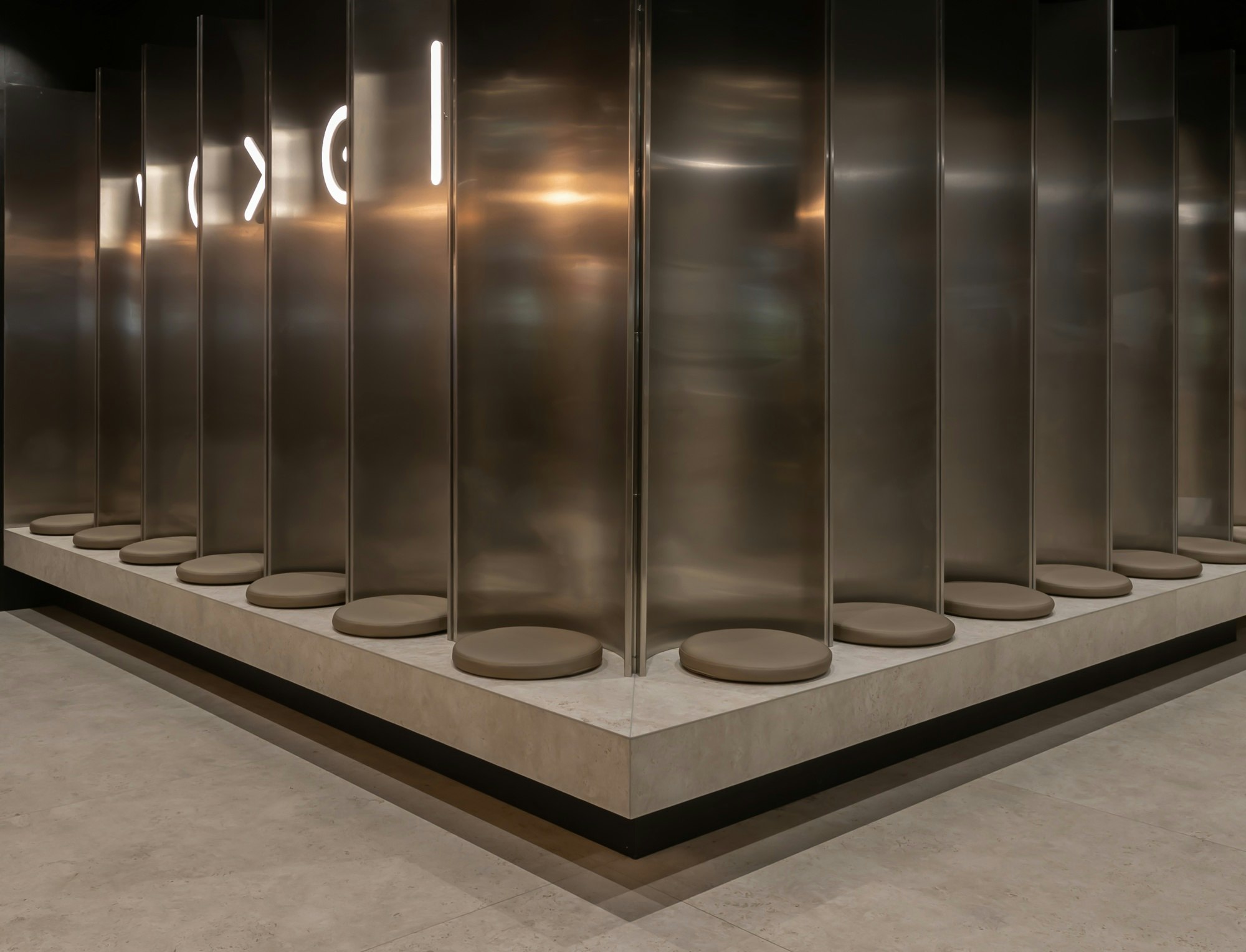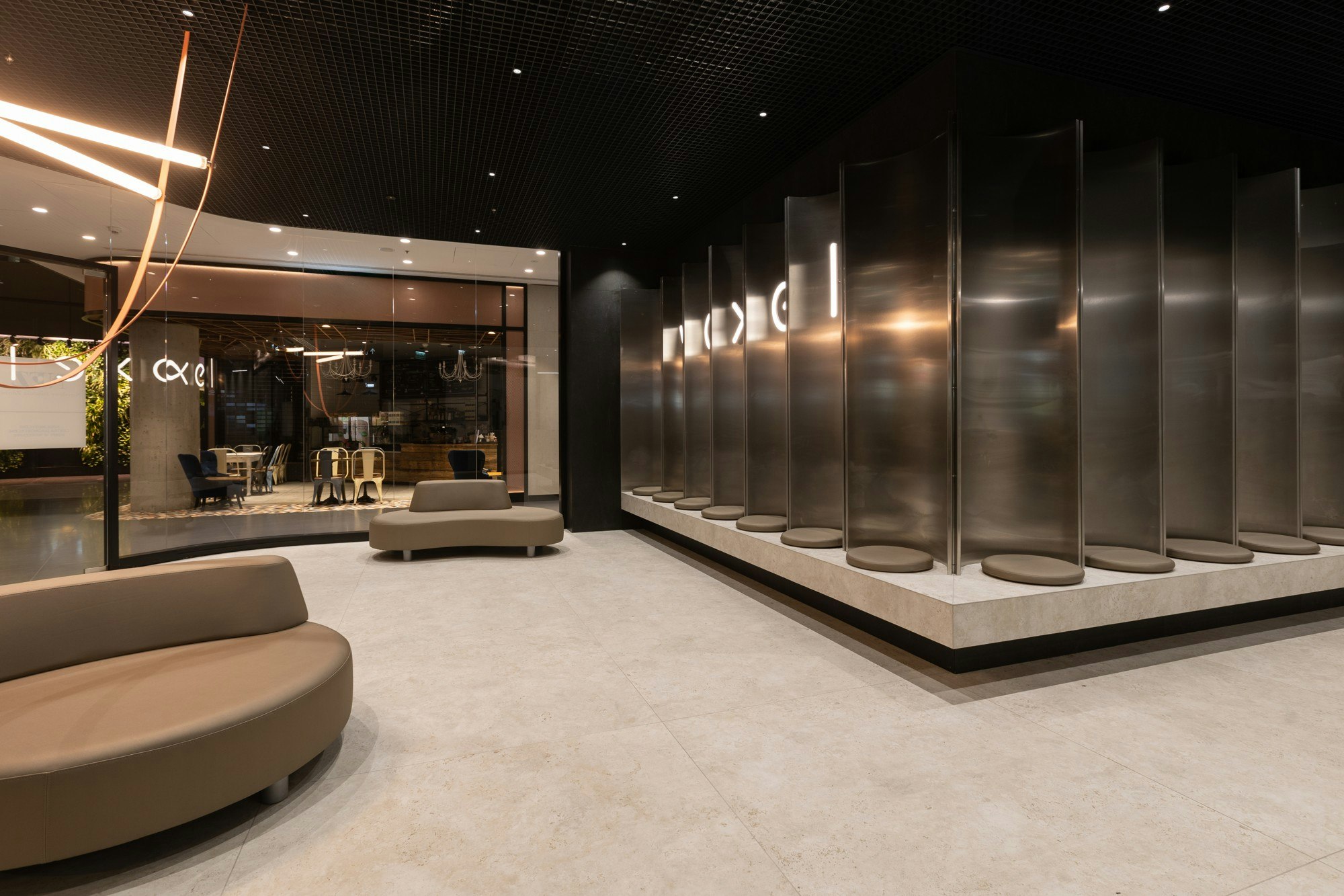 From the moment you enter, you're greeted by a reception area that's far from cold, sterile. The focal point is unusual seating made of rounded metal tubes – reminiscent of a modern lobby design rather than a hospital reception desk. Warm, orange neon light discreetly illuminates the space, creating a cozy atmosphere. This is the first clue that we're dealing with a place where form serves function – and both are subordinated to human comfort.
