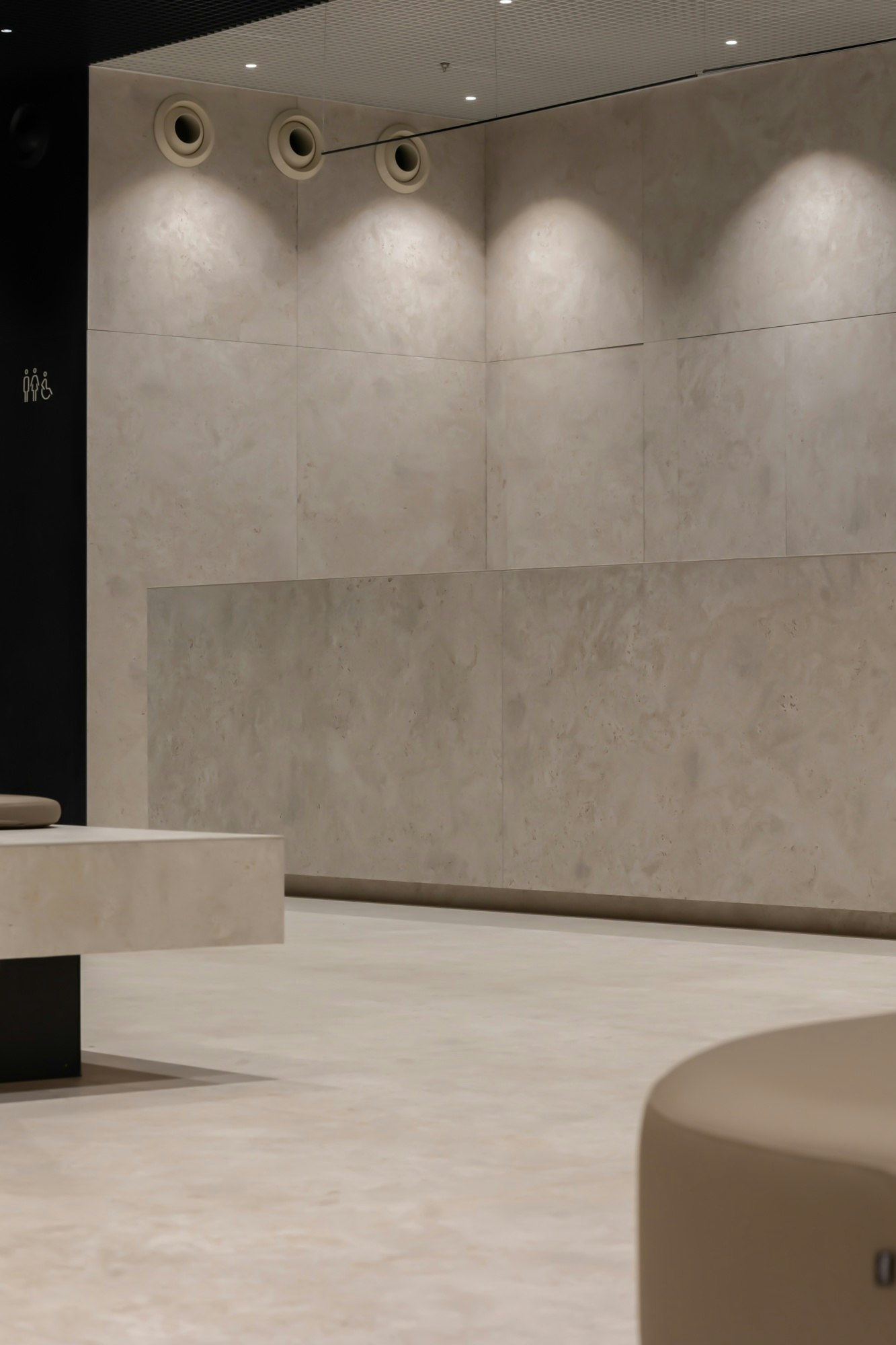 Reception desk, walls and floors cladding and washbasins