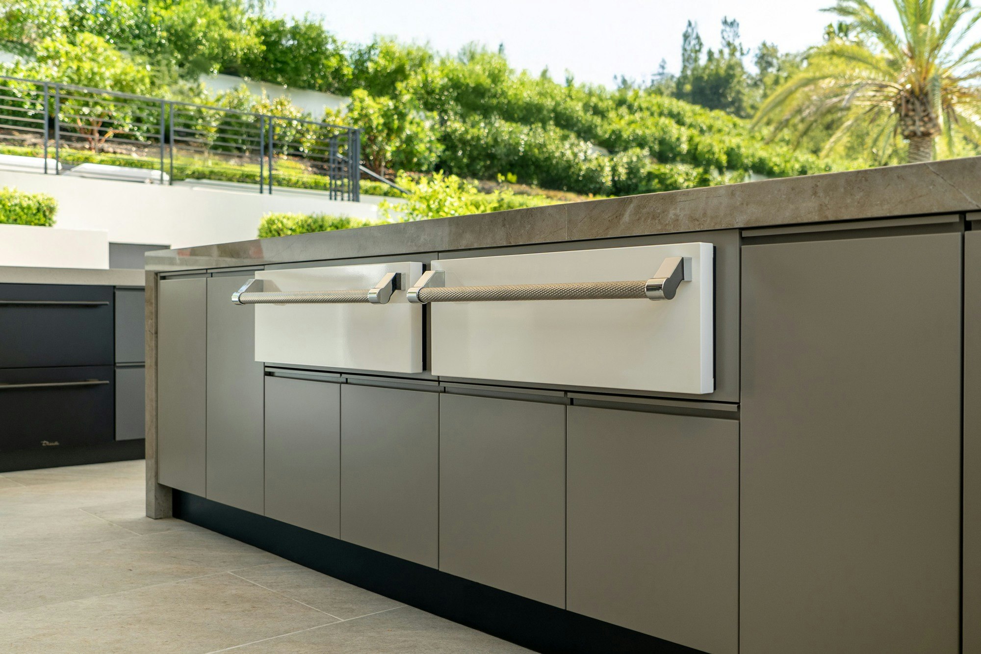 Throughout the space, Dekton surfaces deliver the visual impact and performance needed for this ambitious layout. Chosen for their non-porous composition, resistance to heat and UV rays, and striking finishes, the Dekton countertops seamlessly complement the stainless steel cabinetry from Danver while standing up to the demands of year-round use.