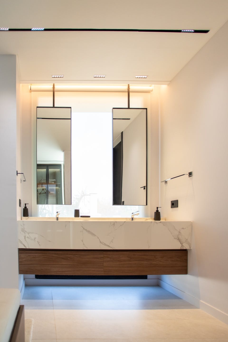 Dekton Somnia introduces intense and organic veining that stands out against white surfaces, while Dekton Domoos, in deep grey, is suited to unique pieces such as the totem with an integrated sink. In the secondary bathrooms and laundry room, Silestone White Zeus is used, a classic and bright finish that facilitates daily maintenance and ensures durability even in high-use areas.