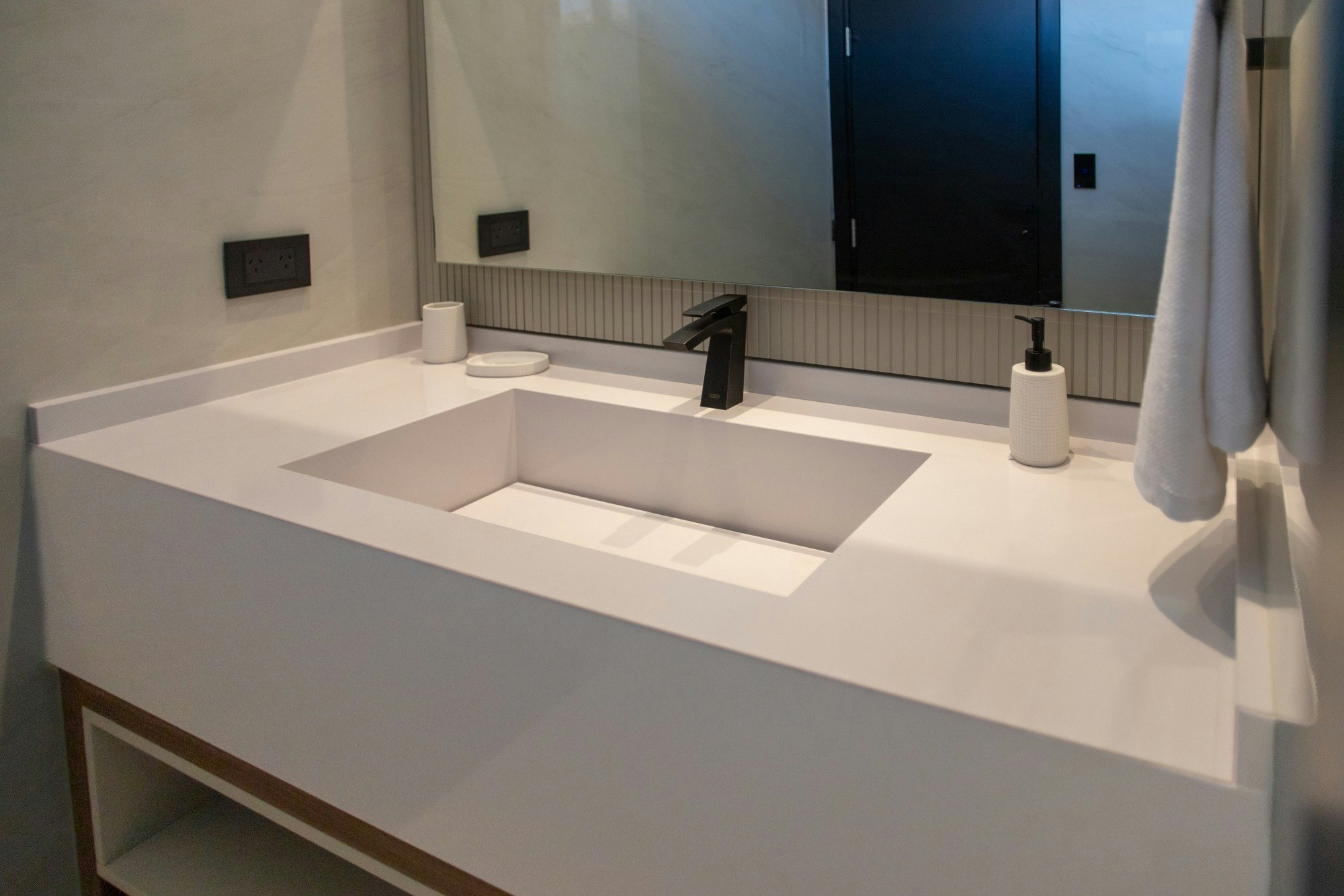 In the bathrooms, the project relies on a combination of tones and textures that distinguish each space without breaking overall coherence. The main bathroom features Dekton Natura, with a light surface and subtle veining, along with an integrated sink, a solution that provides visual cleanliness and eliminates joints. In the guest and courtesy bathrooms, Dekton Somnia and Dekton Domoos are used, both in darker shades and matte finishes that create contrast with the rest of the home.