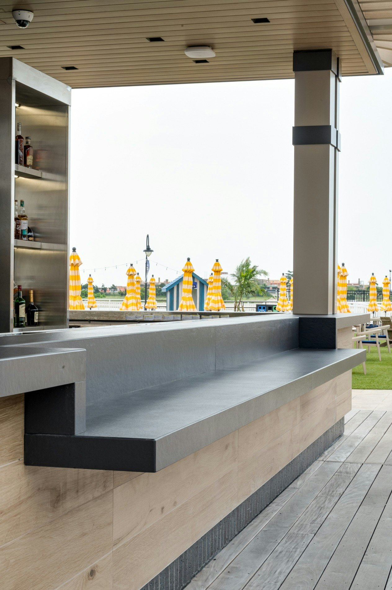 Set against the stunning backdrop of the Atlantic Ocean, the Live Nation Jones Beach Theatre is one of New York’s most iconic outdoor venues. Located on the South Shore of Long Island, the theatre is known for its dramatic coastal setting and unforgettable performances. For its newly renovated VIP area, project architects Howell Belanger Castelli Architects, P.C., sought a surface material that could stand up to the harsh elements of a marine environment without compromising on aesthetics.