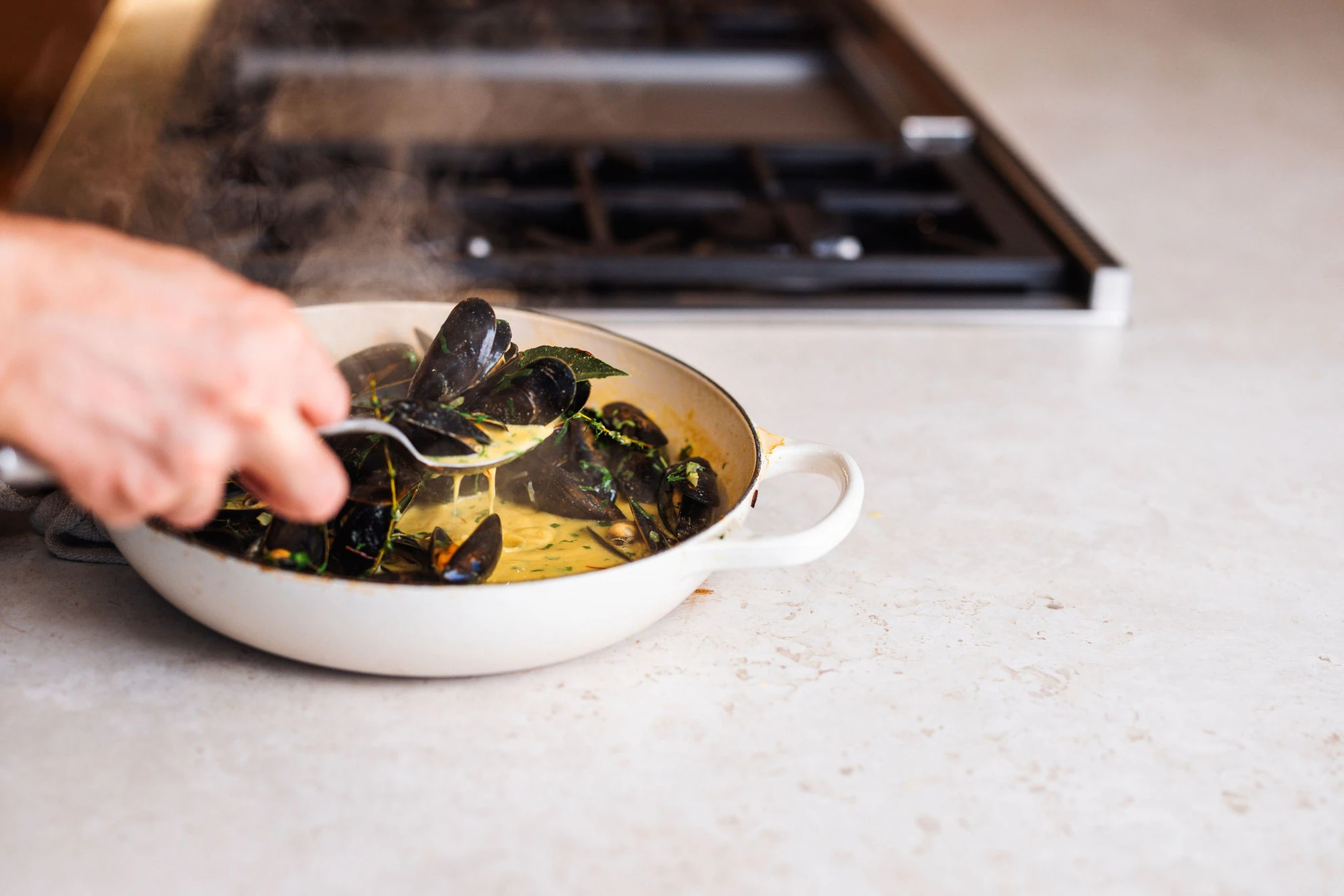 “When I was designing this kitchen, the kitchen of my dreams, I knew it had to perform like a professional one: it had to be durable and withstand a demanding pace, so the choice of worktops was very important to me. I wanted them to have a spectacular look, resembling natural stone, but at the same time, I wanted them to withstand my way of cooking. As a chef, I demand a lot from my work surfaces, and Dekton resists scratches, heat, and doesn’t absorb any liquids, which was very important to me because I always cook with wine, with staining spices… And I’m always pushing heavy pots on it. Dekton was exactly what I needed in my kitchen,” concludes Ryle.