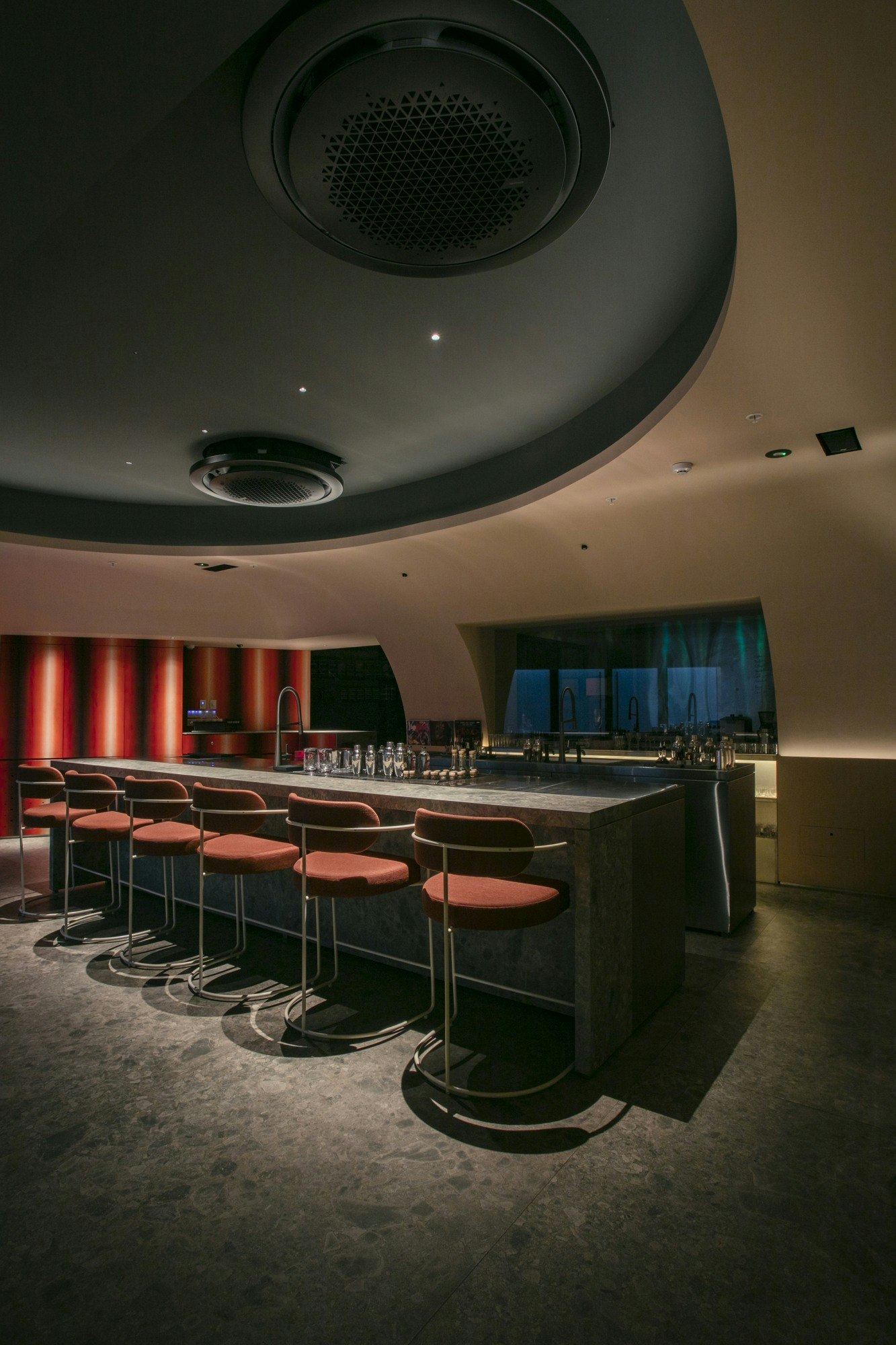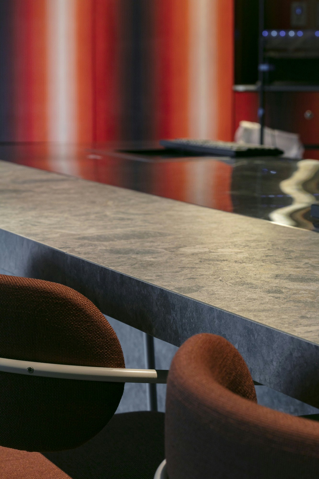 From the client’s perspective, the benefits are clear: “Heat resistance, non-porous surface, cut resistance, and a very balanced combination of colour and texture.” These technical features ensure the design retains its character intact, even in a demanding environment like a high-end cocktail bar.