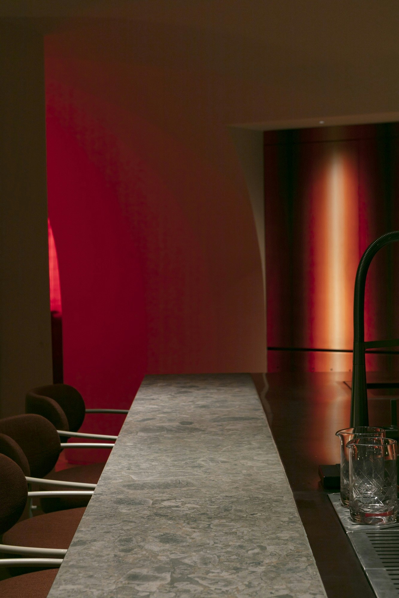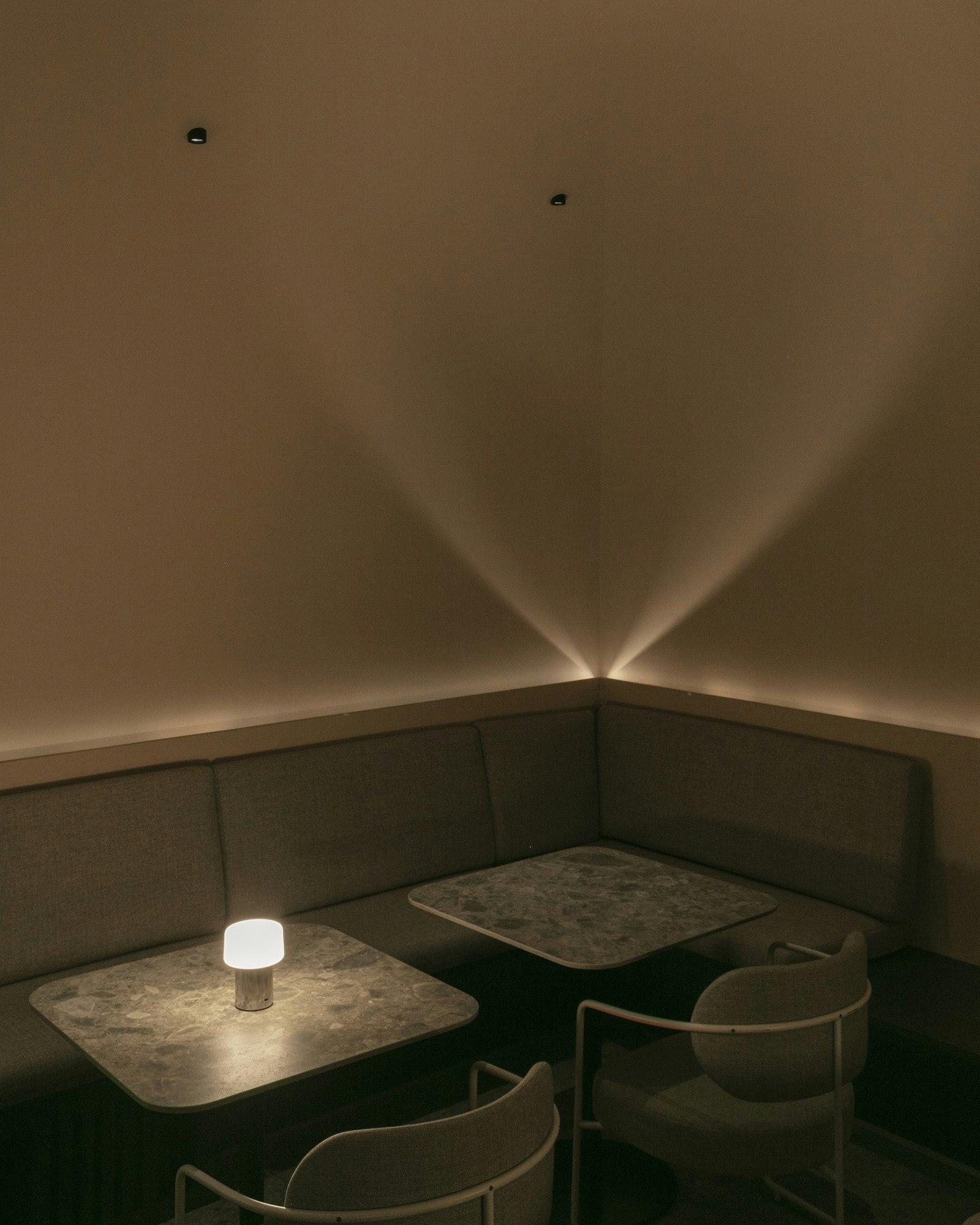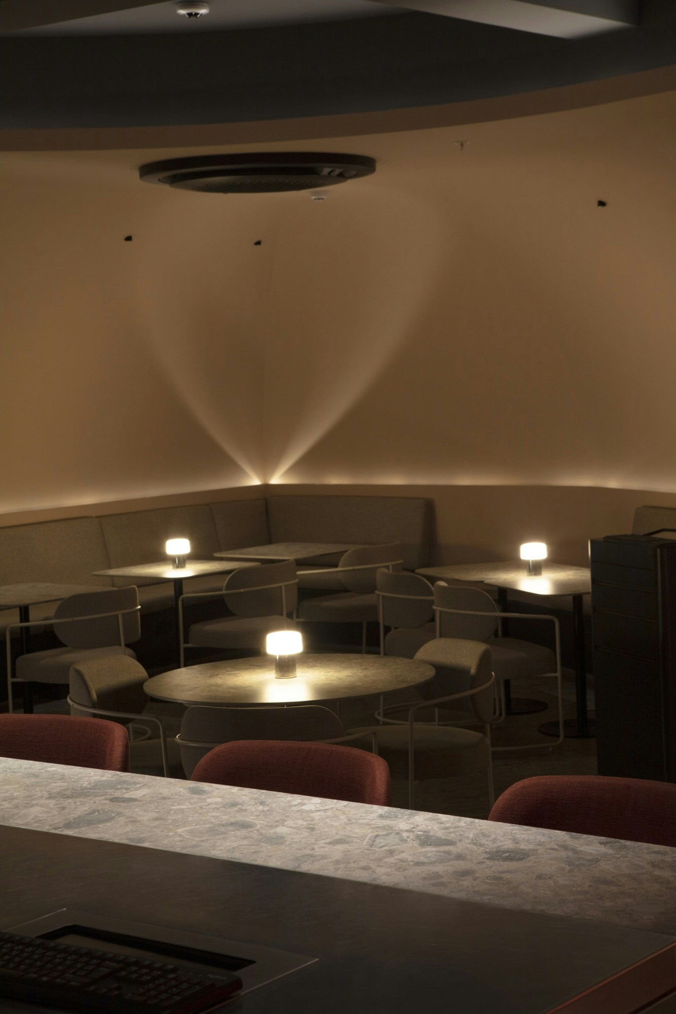 The choice of material was not solely aesthetic. “We chose Cosentino for its technology: it is heat and impact resistant, as well as offering colours and finishes with a natural appearance,” notes Ariadna Floistad Mir. In a bar where the counter is the centre of activity — mixing, ice, utensils, continuous service — the surface needed to provide maximum resistance and long-term stability.