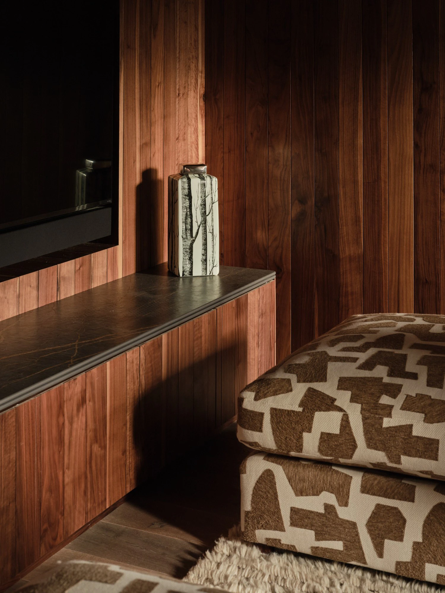 Each bathroom is personalised through the choice of tones and textures: Dekton Neural and Dekton Albarium in Carlotta's bathroom; Dekton Morpheus on the floor and sink in Valentina's bathroom; and Dekton Laurent on the floor and shower area in the guest bathroom, combined with Dekton Awake on the sink. In the cinema room, Dekton Laurent reappears as a furniture surface. Pure material continuity and durability.