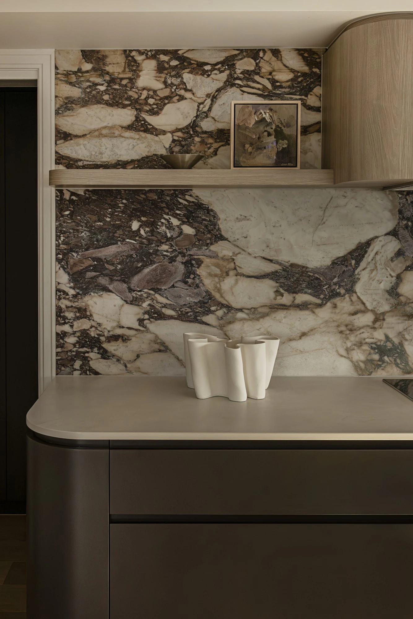 “Dekton Albarium was used in the kitchen, pantry and laundry room to ensure continuity and practicality in high-use areas. Its high resistance to stains, scratches and heat made it an ideal choice for these spaces, especially in a home where the kitchen serves as the central hub,” says Newr. “The material was also chosen for its ability to complement the richness of the Calacatta Viola marble fronts, allowing this natural stone surface to remain the focal point while reinforcing the coherence of the material palette,” they continue.