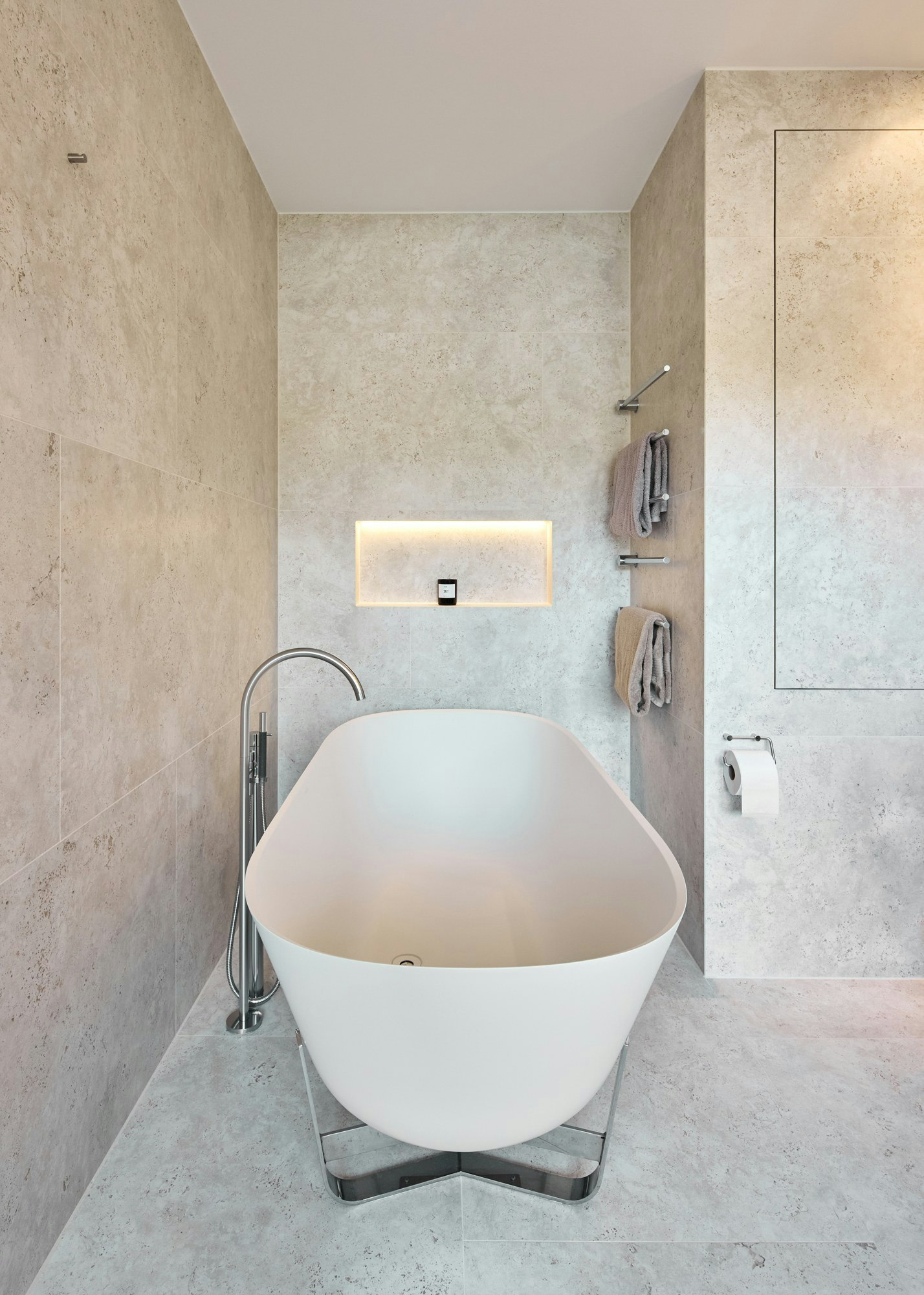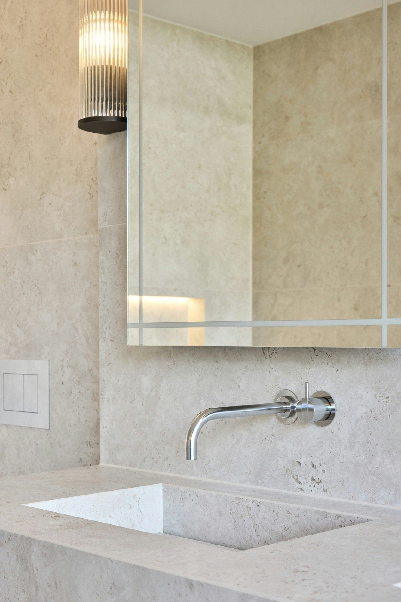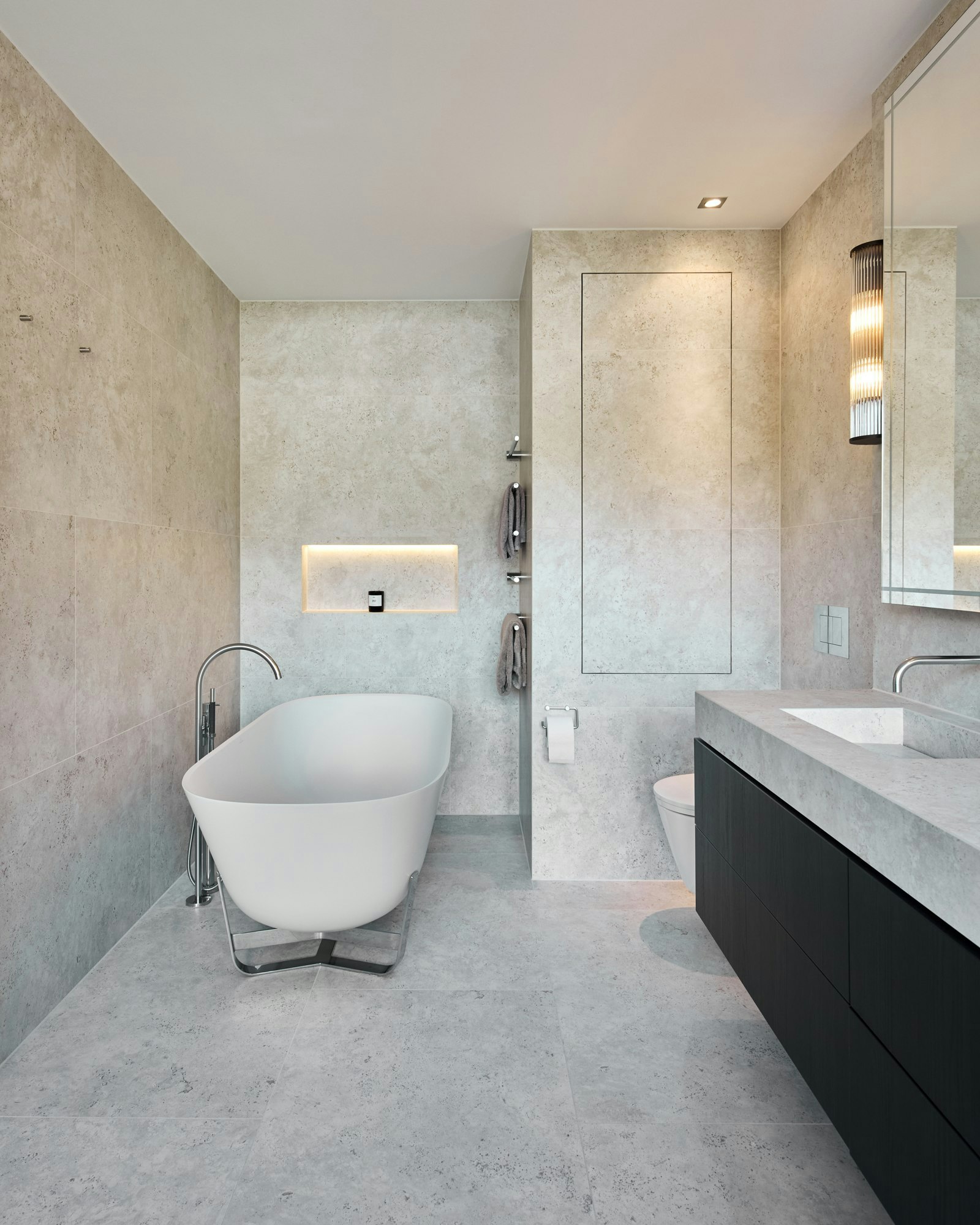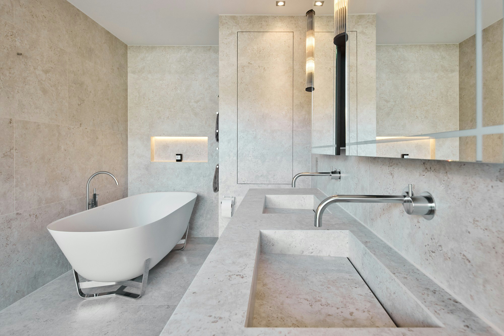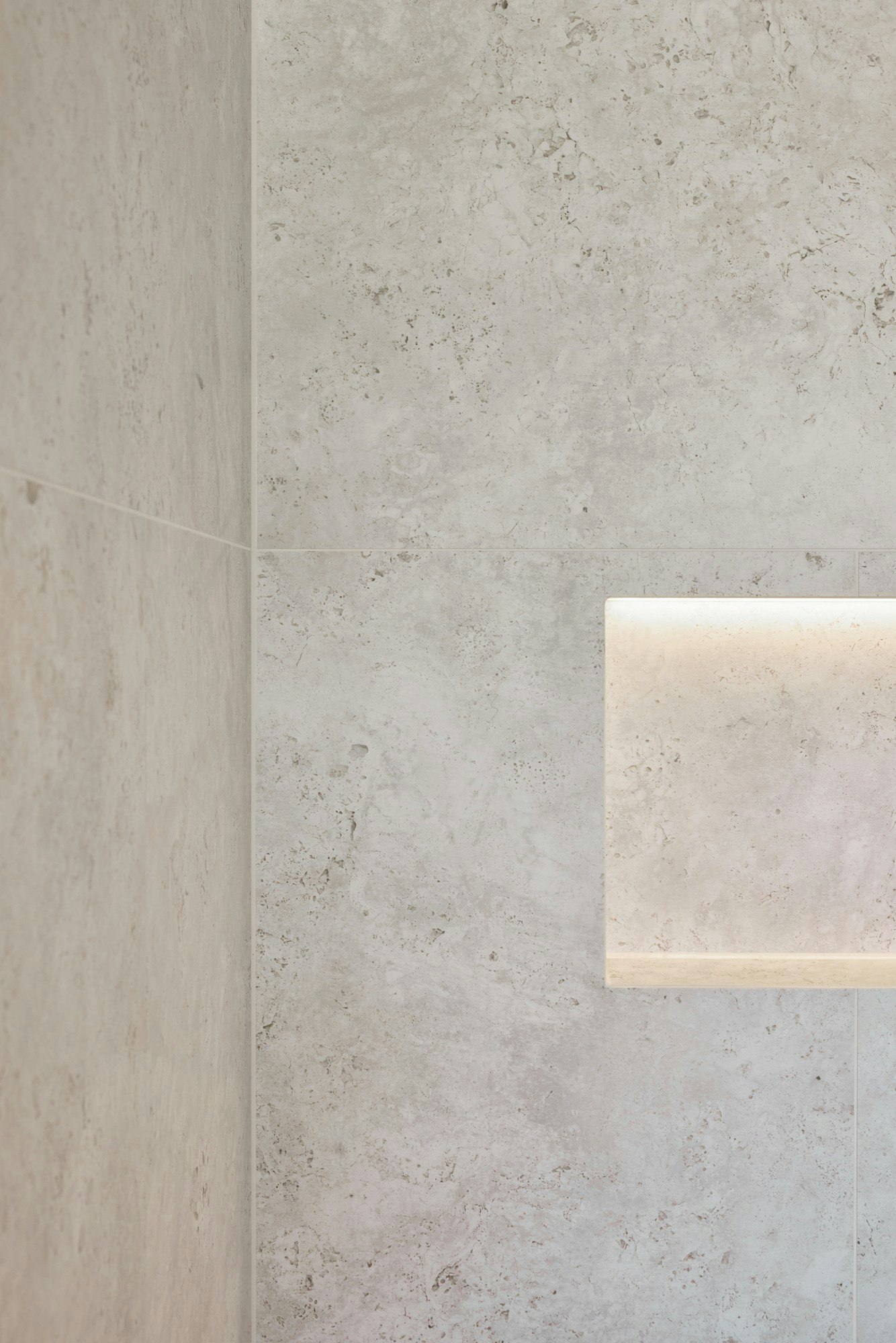 Die sorgfältig platzierte Beleuchtung verstärkt die Tiefe des Materials. Sanftes Licht fällt auf die Oberflächen, hebt die Nuancen des neu interpretierten Travertins hervor und erzeugt eine warme und ruhige Atmosphäre. Die Textur von Dekton trägt zu diesem taktilen Gefühl bei. „Dekton sieht fantastisch aus, bietet ein unglaubliches Gefühl, ist leicht zu pflegen und nahezu unzerstörbar. Uns gefiel auch, dass es monolithische Designs ermöglicht“, schließt das Studio.