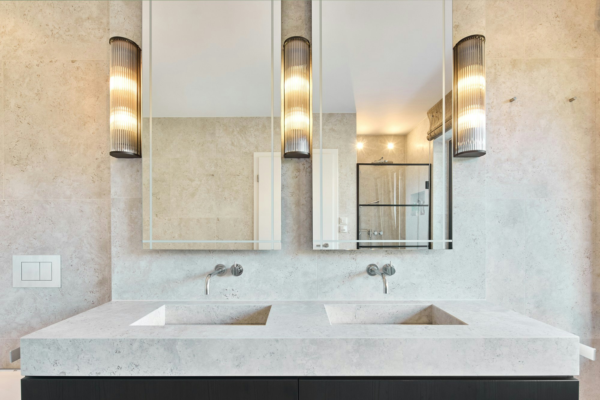 Das auffälligste Stück ist das Doppelwaschbecken Silence, ebenfalls aus Dekton Sabbia gefertigt. Es wurde als eine einzige monolithische Masse konzipiert und scheint mit der Zartheit eines stillen Wasserfalls aus der Wand zu entstehen. Sein Design ist rein und funktional, mit klaren Linien, die sich visuell in die Architektur integrieren. „Der Kontrast zwischen dem dunklen Holz und dem hellen Dekton-Ton schafft eine ganz besondere Harmonie“, betont Thomas Mang, das auf große Formate setzte, um Fugen zu vermeiden und das Gefühl von Kontinuität zu verstärken.