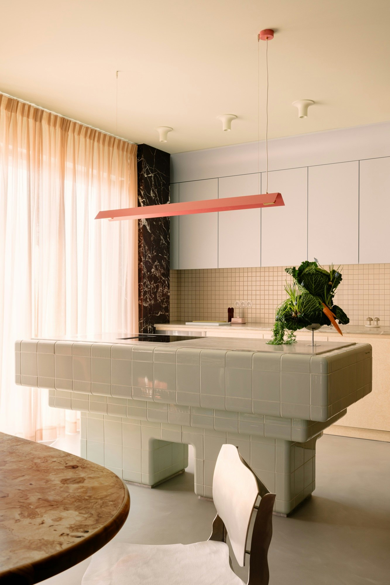 The central kitchen island was clad in custom tiles and topped with Sensa Vancouver, a Brazilian quartzite from Cosentino, which, as the architect emphasizes, impresses not only with its culinary-inspired appearance but above all with its durability in everyday use. Vancouver impresses with its matte finish, and Cosentino protects its surface with a unique coating that penetrates the stone's structure, protecting it from stains.