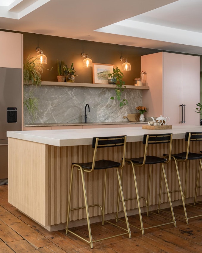 The central island, standing at 4.6 x 1.35m, was to form the main working area for the kitchen. Dekton Argentium was chosen, and mitre joined to give 60mm thick appearance to the island surface.