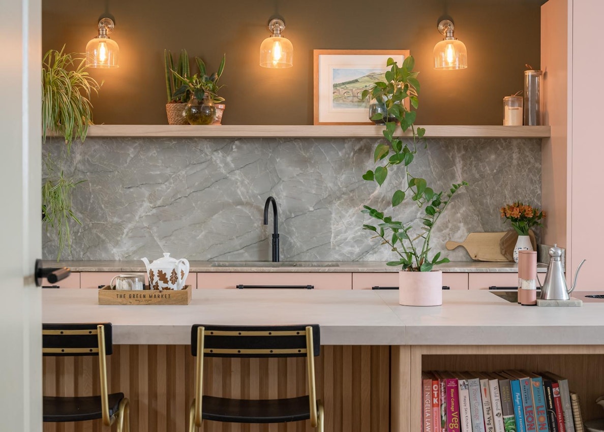 The sink area work surface and splashback was then fabricated from Sensa Vancouver quartzite to add a luxurious back drop to the kitchen.
