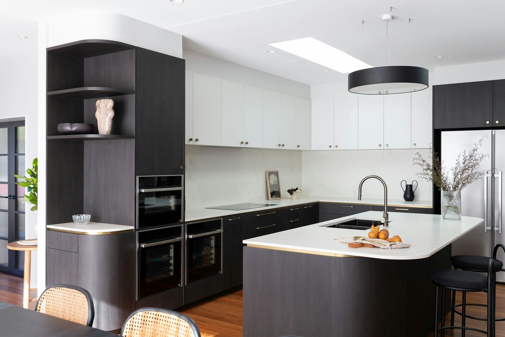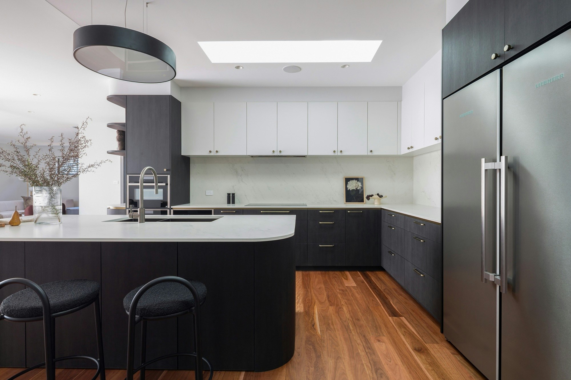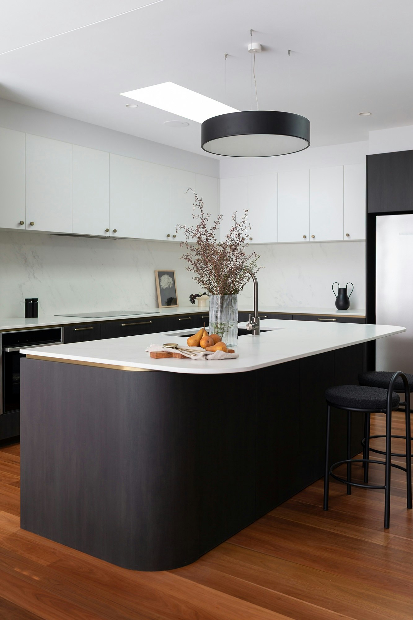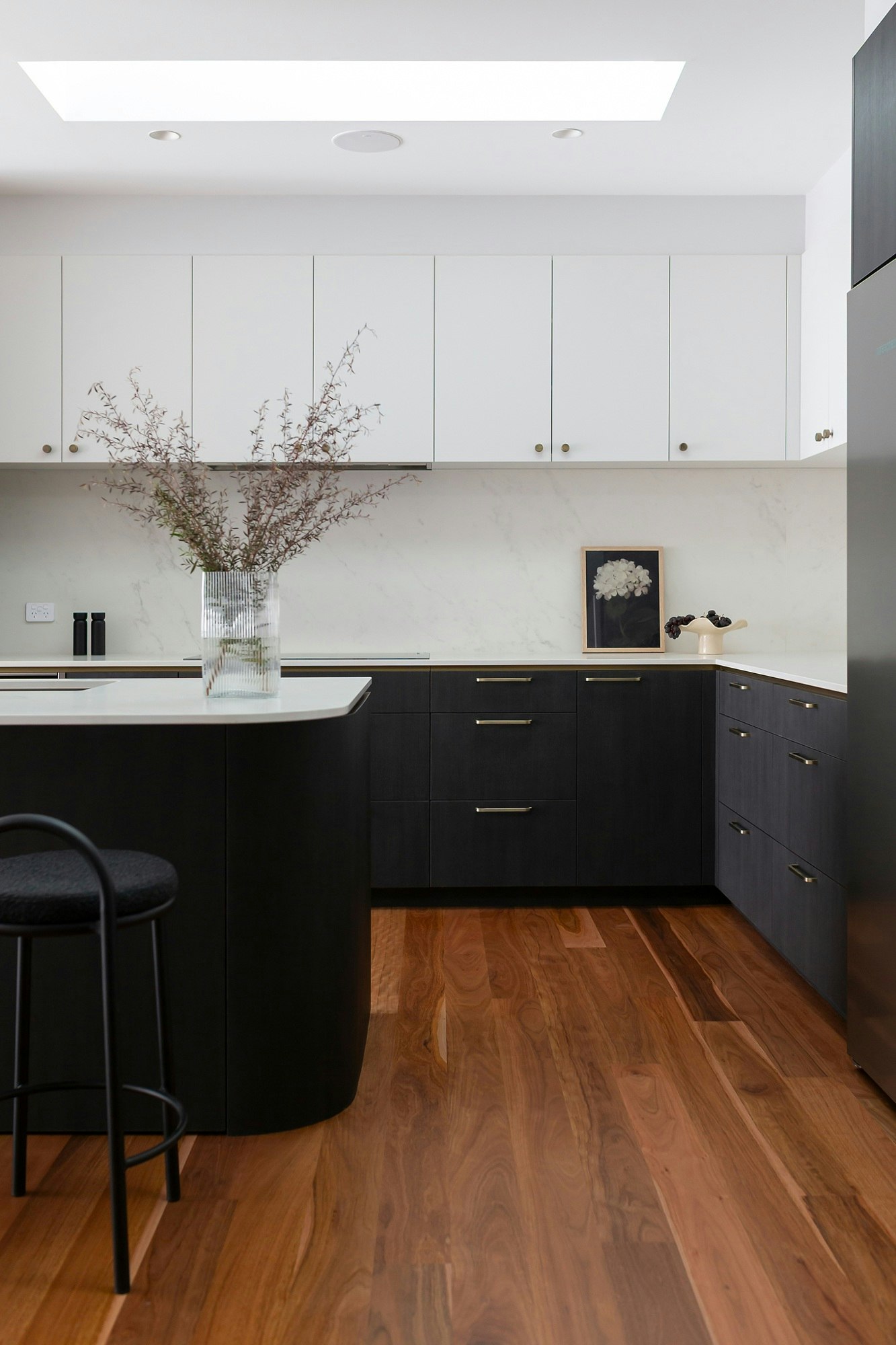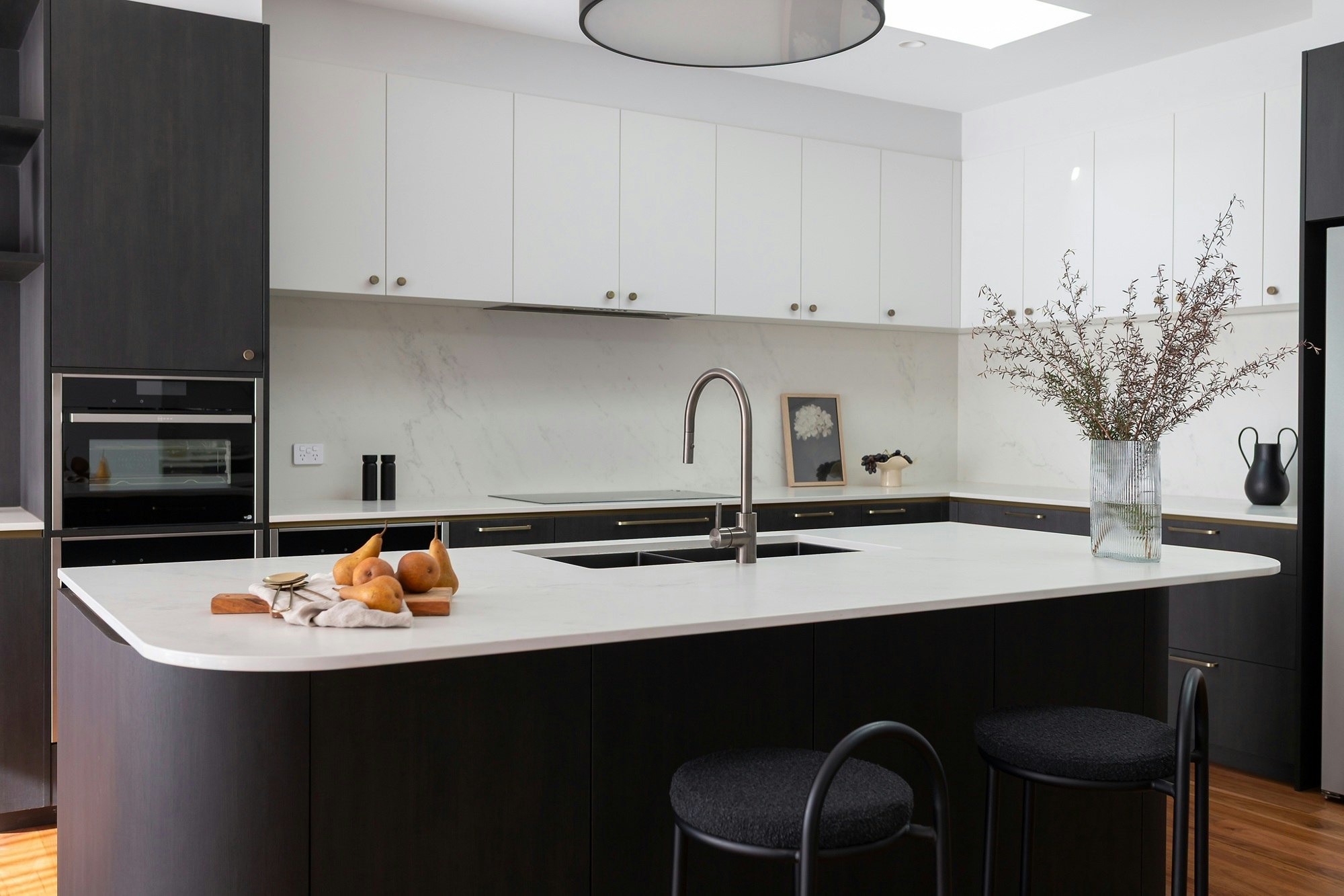 A sophisticated black-and-white kitchen forms the heart of this Australian home, featuring contemporary shapes, materials, and colours. The wooden flooring adds warmth to the space, which is elevated with elegance through details like the island's curves, bronze-coloured handles, and artistic pieces.