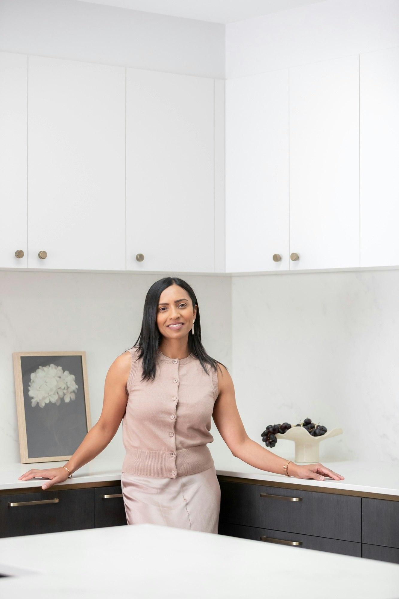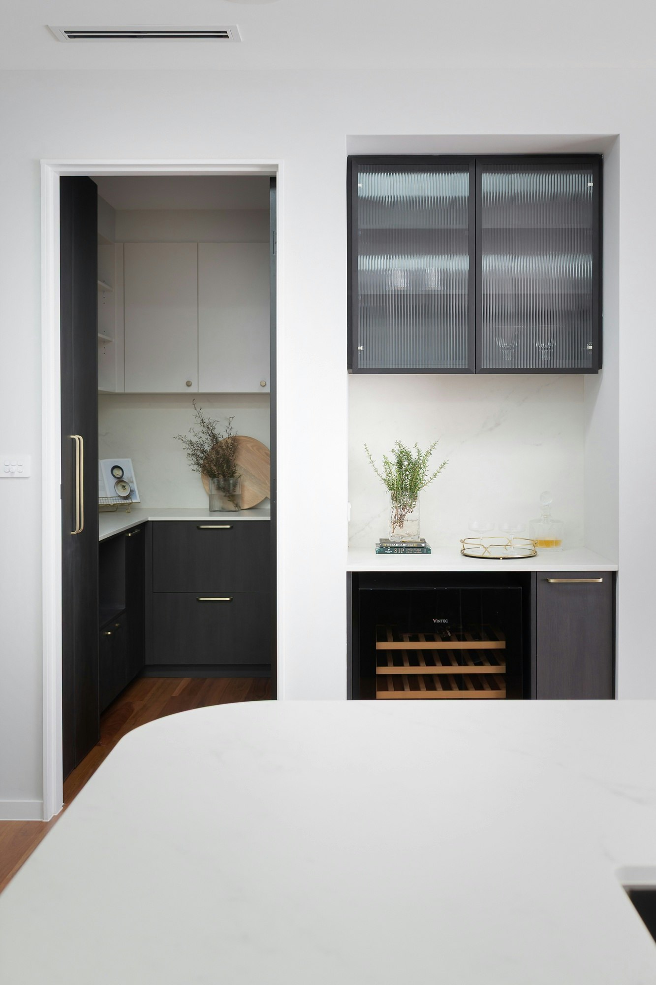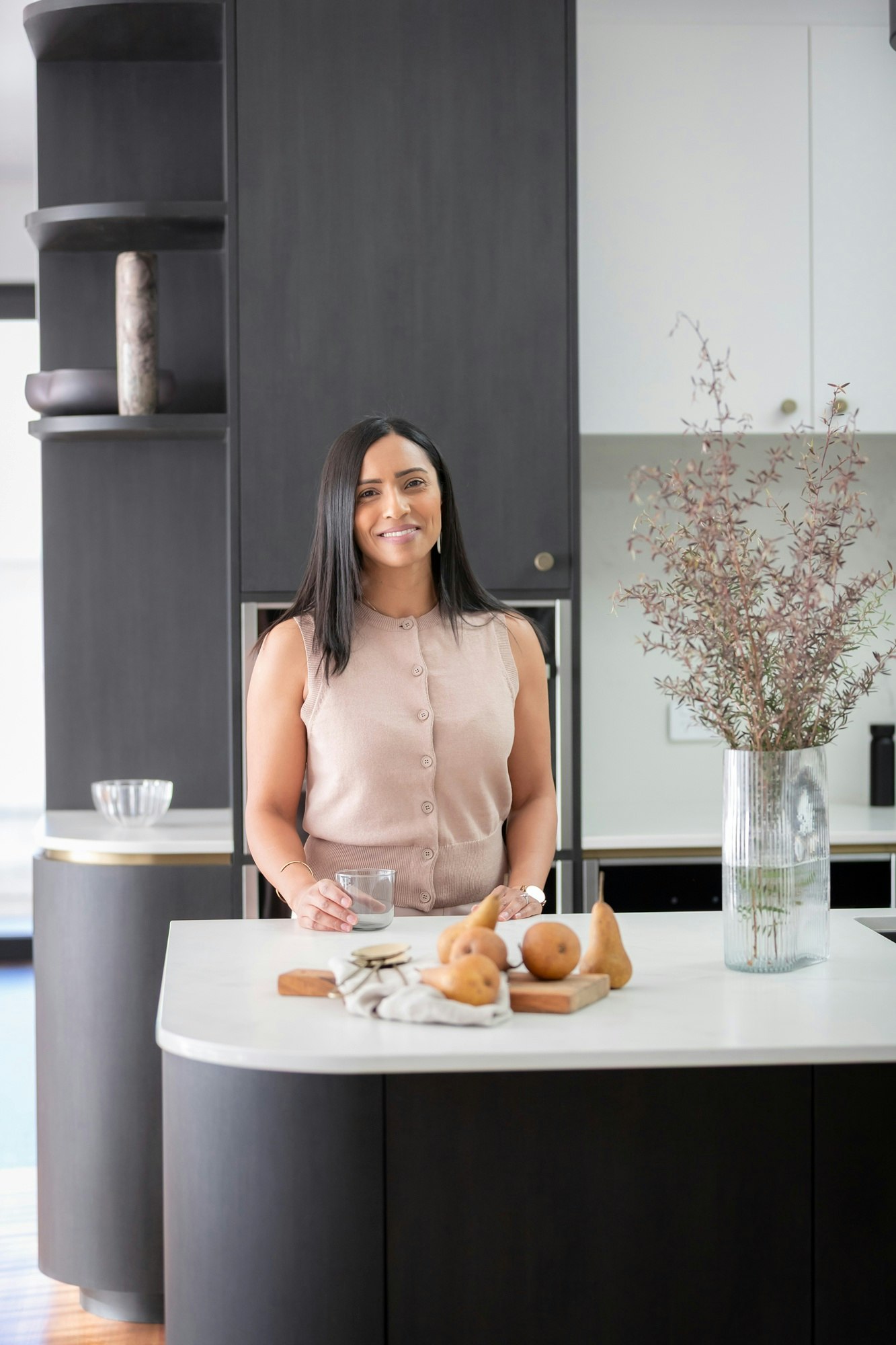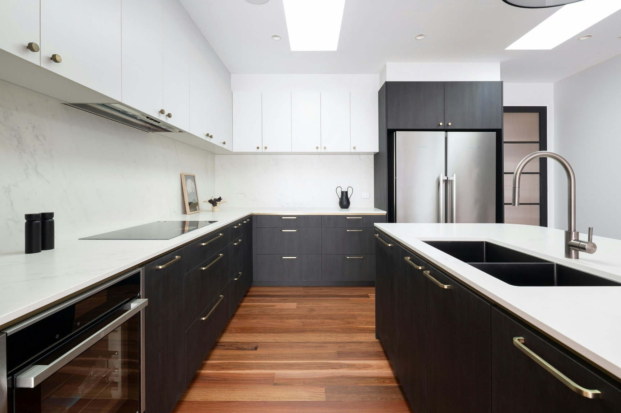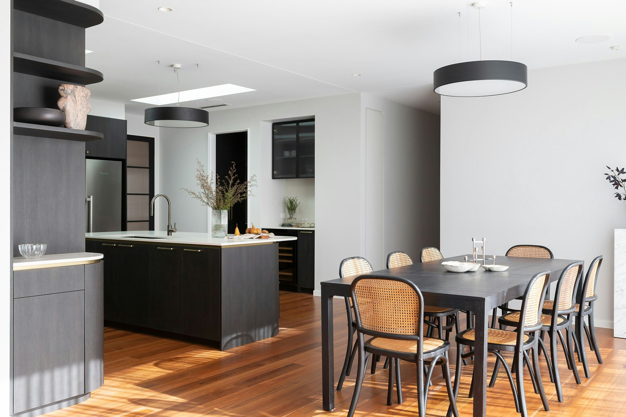 A sophisticated black-and-white kitchen forms the heart of this Australian home, featuring contemporary shapes, materials, and colours. The wooden flooring adds warmth to the space, which is elevated with elegance through details like the island's curves, bronze-coloured handles, and artistic pieces.