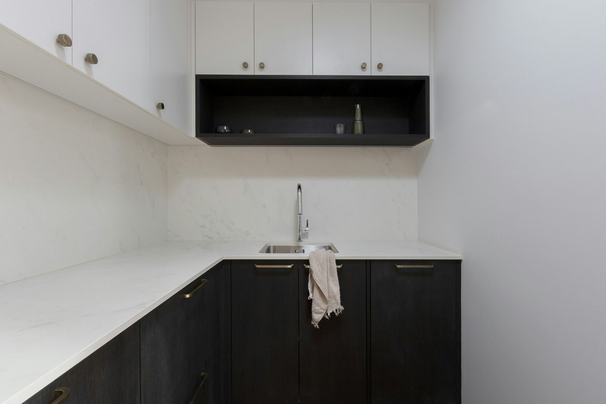 The asymmetrical grey veining on a white base of Dekton Marina, which reinterprets the classic elegance of Carrara marble, serves as the perfect transition to blend the black lower cabinetry with the white upper cabinetry.