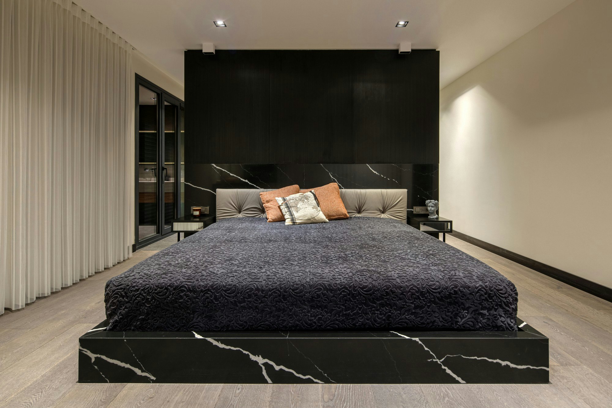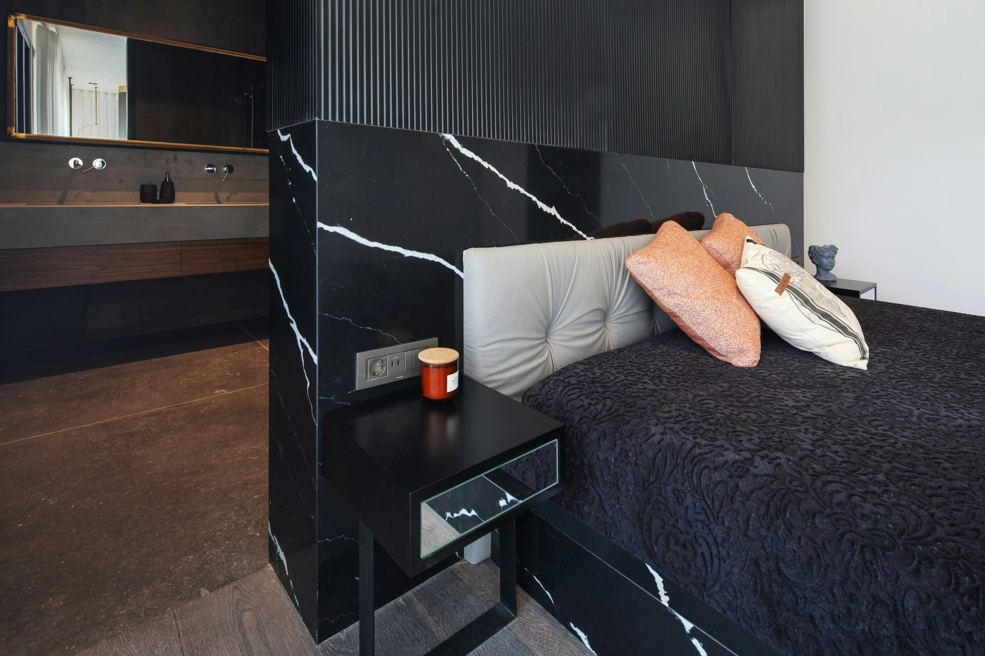 The versatility of Silestone allowed the designer to create a bespoke bed. The colour chosen was Eternal Marquina: “it was the product that best captured the deep black effect I was looking for when I designed the bed, with its beautiful contrasting white veins”, explains the designer. Inspired by Spanish black Marquina marble, this colour is so powerful that, when used on the bed, it becomes the highlight of the entire room.