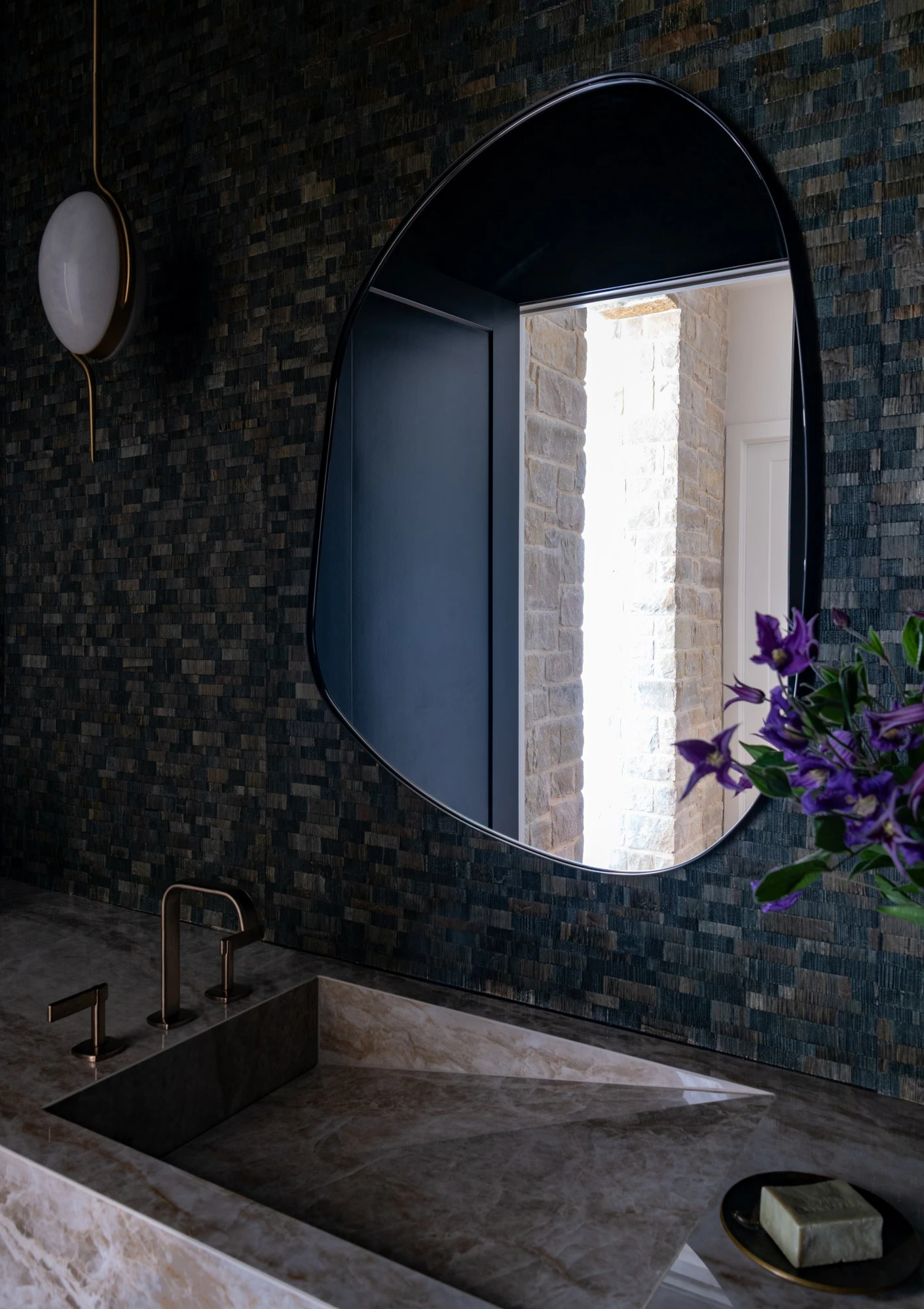 Cosentino materials were selected to meet the dual demands of performance and design flexibility. In the wine bar, Silestone Charcoal Soapstone was fabricated into a pronounced radius curve, setting the tone for the custom applications throughout the home. The main kitchen pairs Dekton Ceppo countertops with a tall backsplash and raised island detail, creating visual impact while standing up to daily cooking and entertaining.