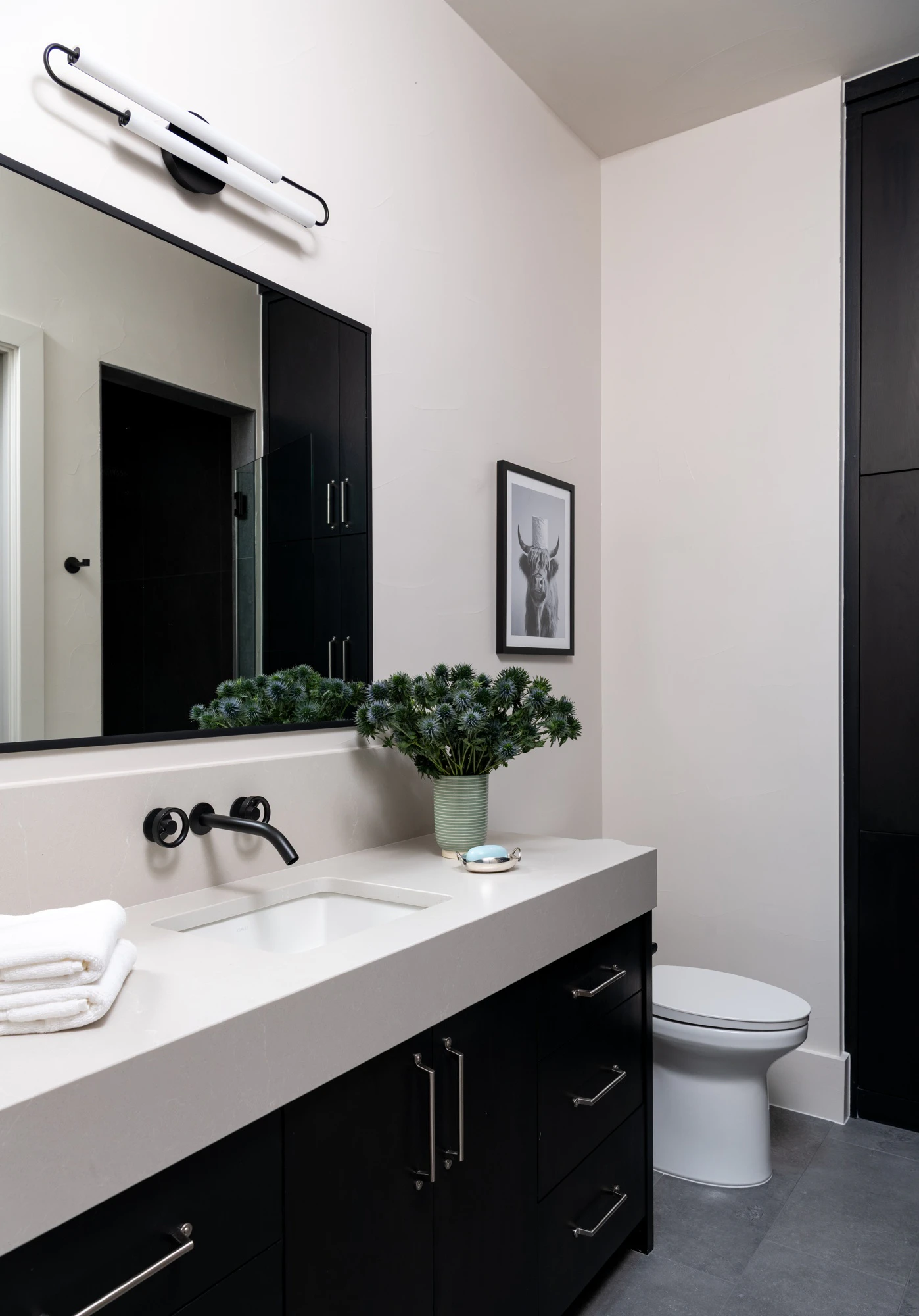 In the game room, Dekton Marmorio forms a waterfall edge and continues seamlessly between interior and exterior bars. The primary bath features a sculptural island-style vanity in Dekton Neural with a dramatic drop edge, while the powder room showcases a fully clad floating vanity in Dekton Taga with an integrated side-draining sink.