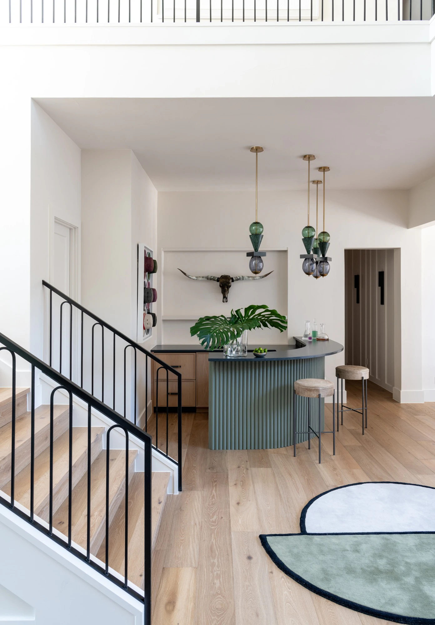 Expansive windows flood the interiors with natural light and frame backyard views, reinforcing a strong indoor-outdoor connection. A grounded palette of earthy tones anchors the spaces, while unexpected complementary accents in paint, furnishings, and art introduce personality and energy. The result is a home that feels relaxed and welcoming, yet highly considered in every detail.