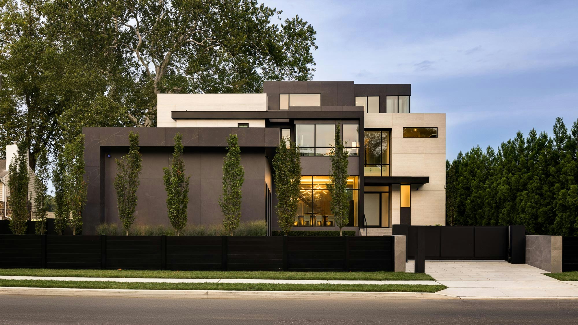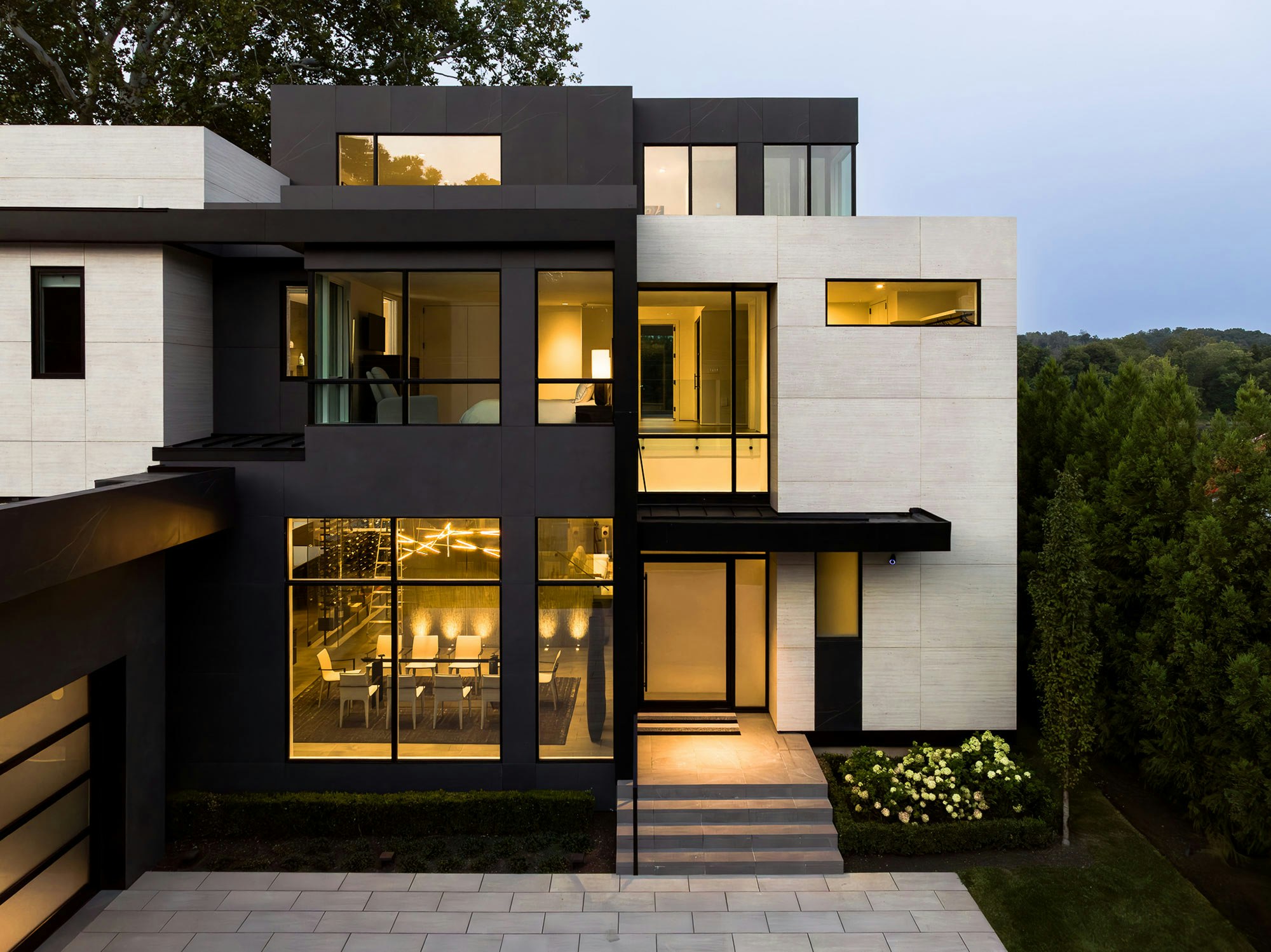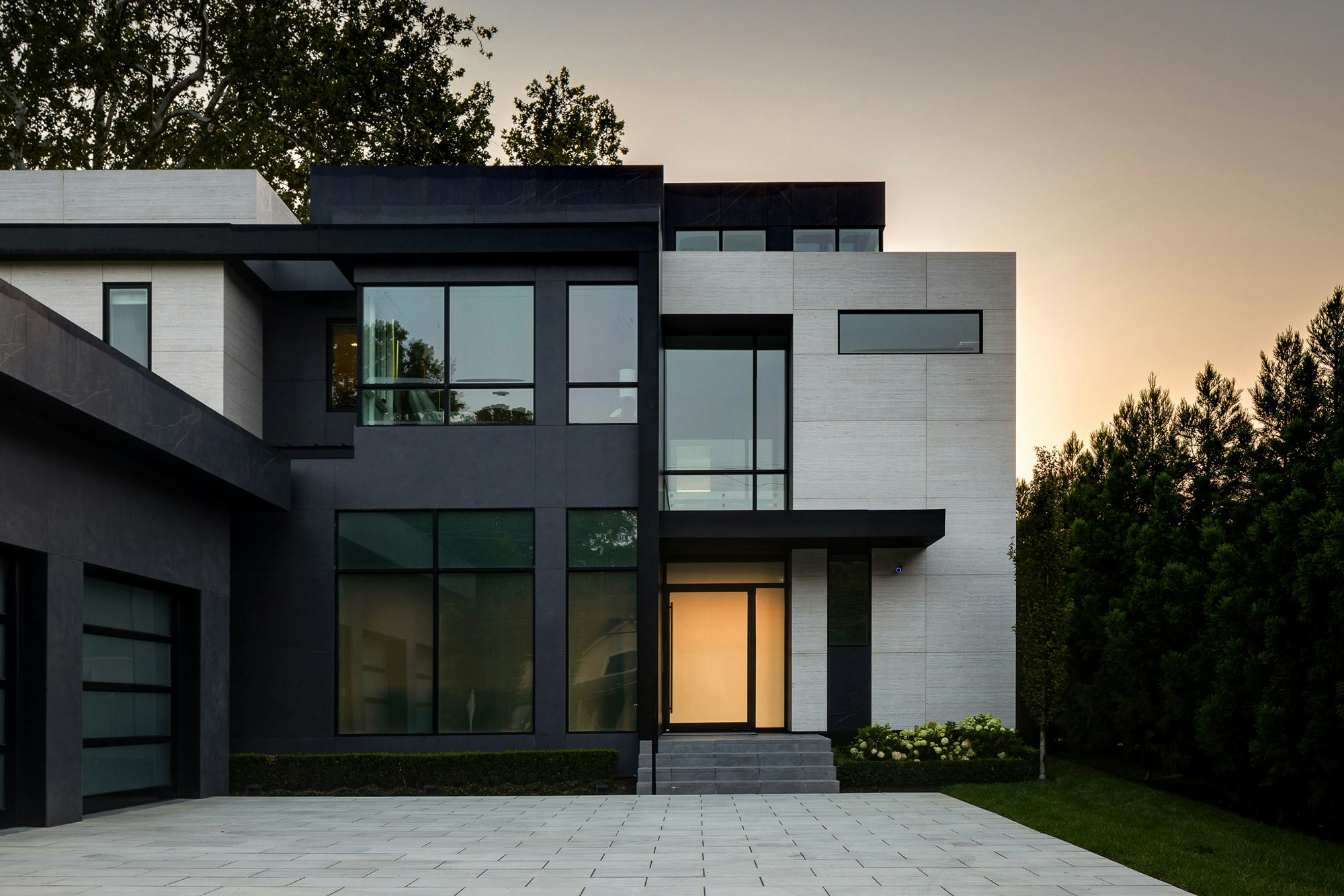 The design called for a layered visual effect, combining multiple Dekton colors - Kelya, Marmorio, and Domoos - to create depth and contrast in the home’s exterior. This blend of dark and cream tones played beautifully against the natural backdrop while complementing the oversized windows and doors that define the home’s front and rear elevations.