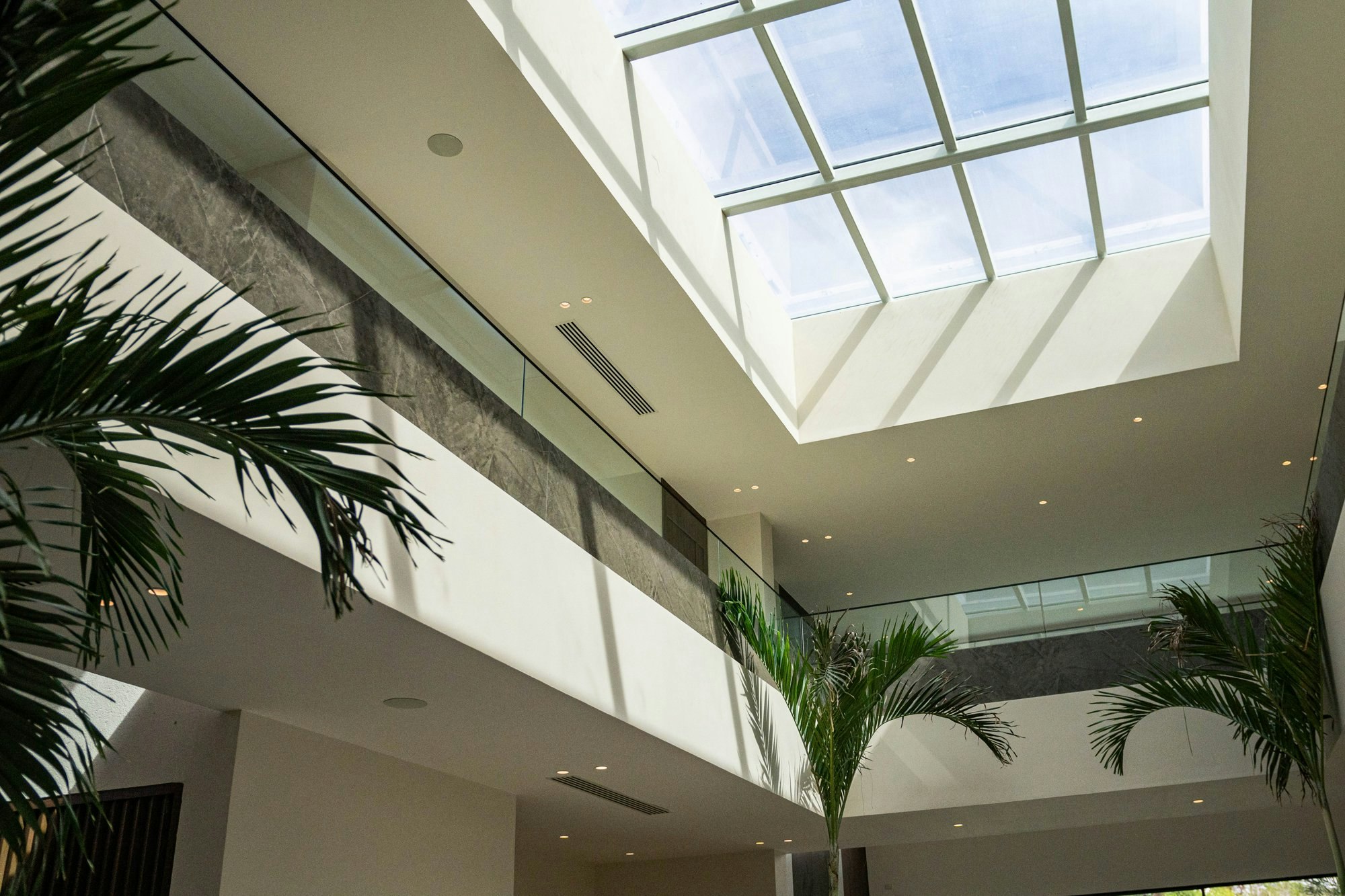 The central staircase is conceived as a sculptural element. Fully executed in Dekton Kira with a total of 100 m2, it stands out for its continuous planes and the contrast between the greyish tone of the material and the brightness of the atrium. The same chromatic reference ascends through the walls of the interior void, where another 365 m2 of Dekton Kira act as continuous cladding, elevating the scale of the space and accentuating the monumental character of the double height.