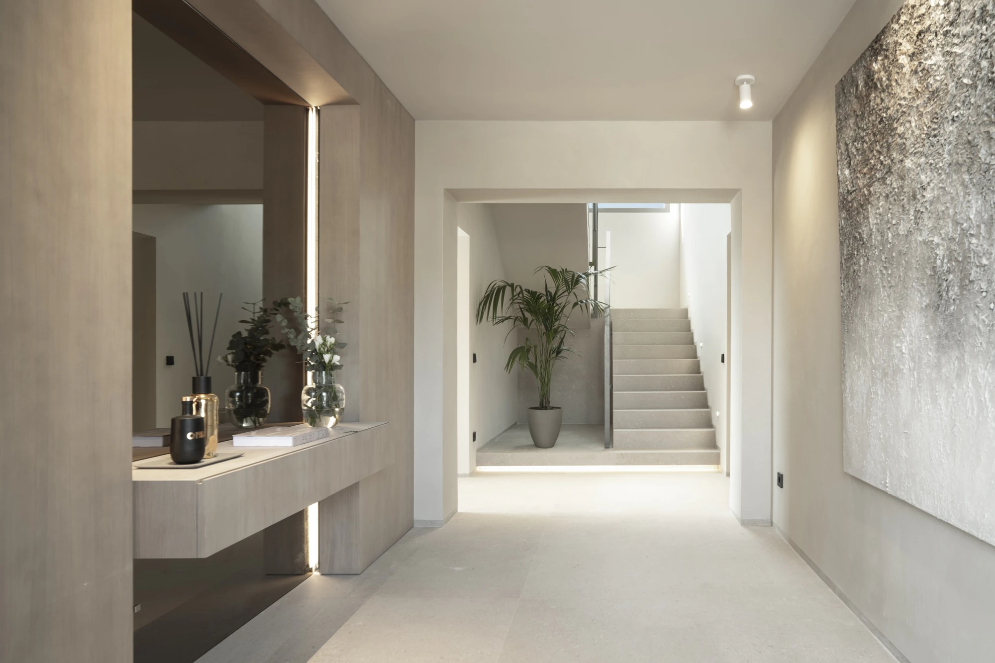 The stairs, also finished in Avorio, reinforce the vertical reading of the project. The large-format, straight-edged steps create an architectural element that visually integrates with the walls and floor. The same material strategy is maintained in the spa and gym, with continuous flooring that withstands both foot traffic and the constant presence of moisture, steam, or impact from sports equipment.