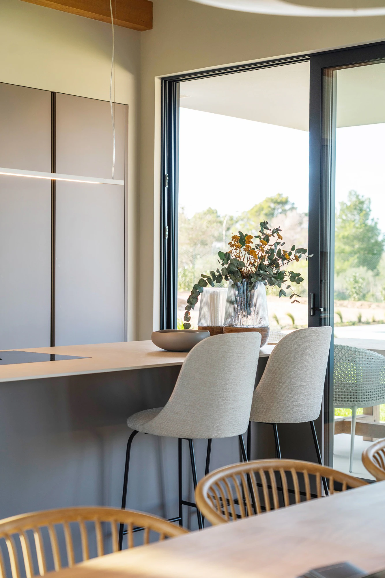 One of the architectural challenges was maintaining the local Mediterranean aesthetic despite the strong focus on eco-friendly and low-maintenance materials. The use of a tone like Dekton Nacre, combined with the wooden structure, allowed for that warm and luminous touch so characteristic of Mallorca.