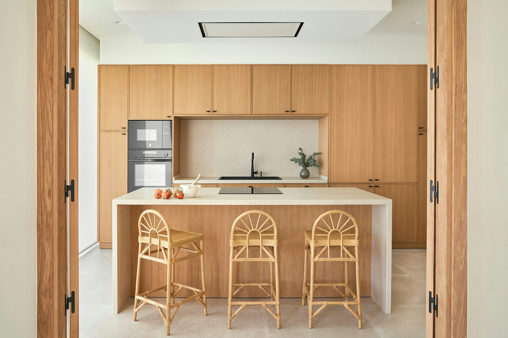 Oak wood is the star of this project, where it has been used particularly in the kitchen and bathroom. The rest of the materials used, such as microcement and paint, are all part of the same colour range, giving a natural feel to the different spaces. The living room and kitchen are connected by a central partition wall with shelves and alcoves on both sides, providing plenty of storage space for both rooms. Large windows connect the interior to the garden and swimming pool, blurring the boundaries between inside and out. A floor-to-ceiling solid door separates the private bedroom and bathroom area from the rest of the house.