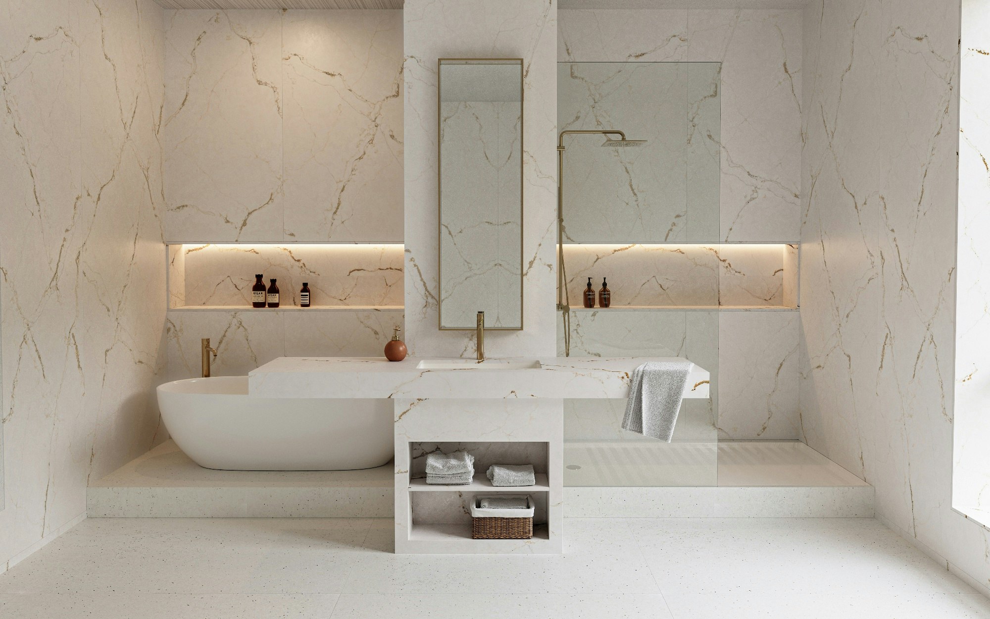 - Dream bathrooms: a bathroom with a veined cladding is synonymous with refinement and relaxation. From washbasins and countertops to shower wall claddings, every detail becomes a unique and sophisticated sensory experience.