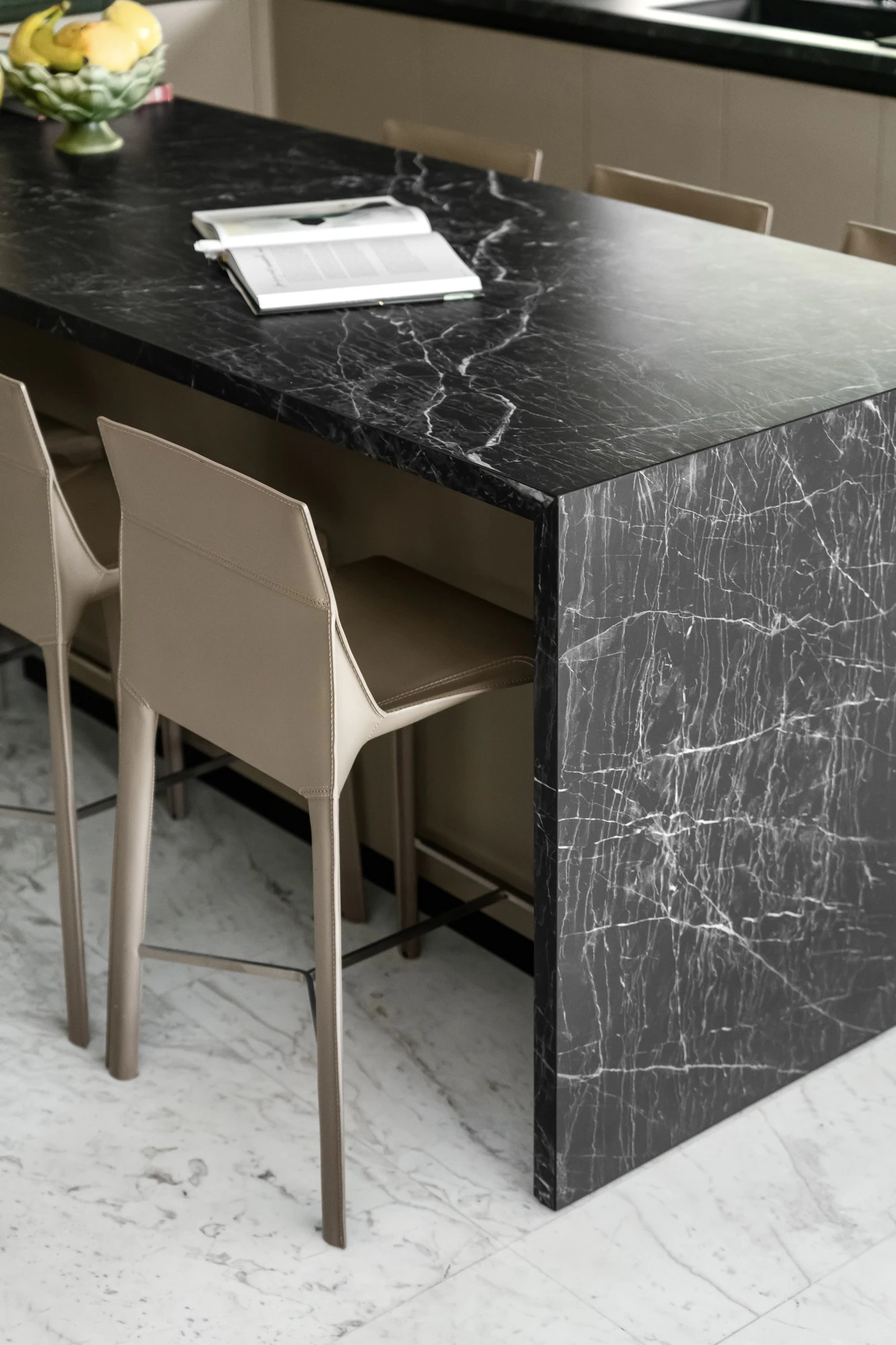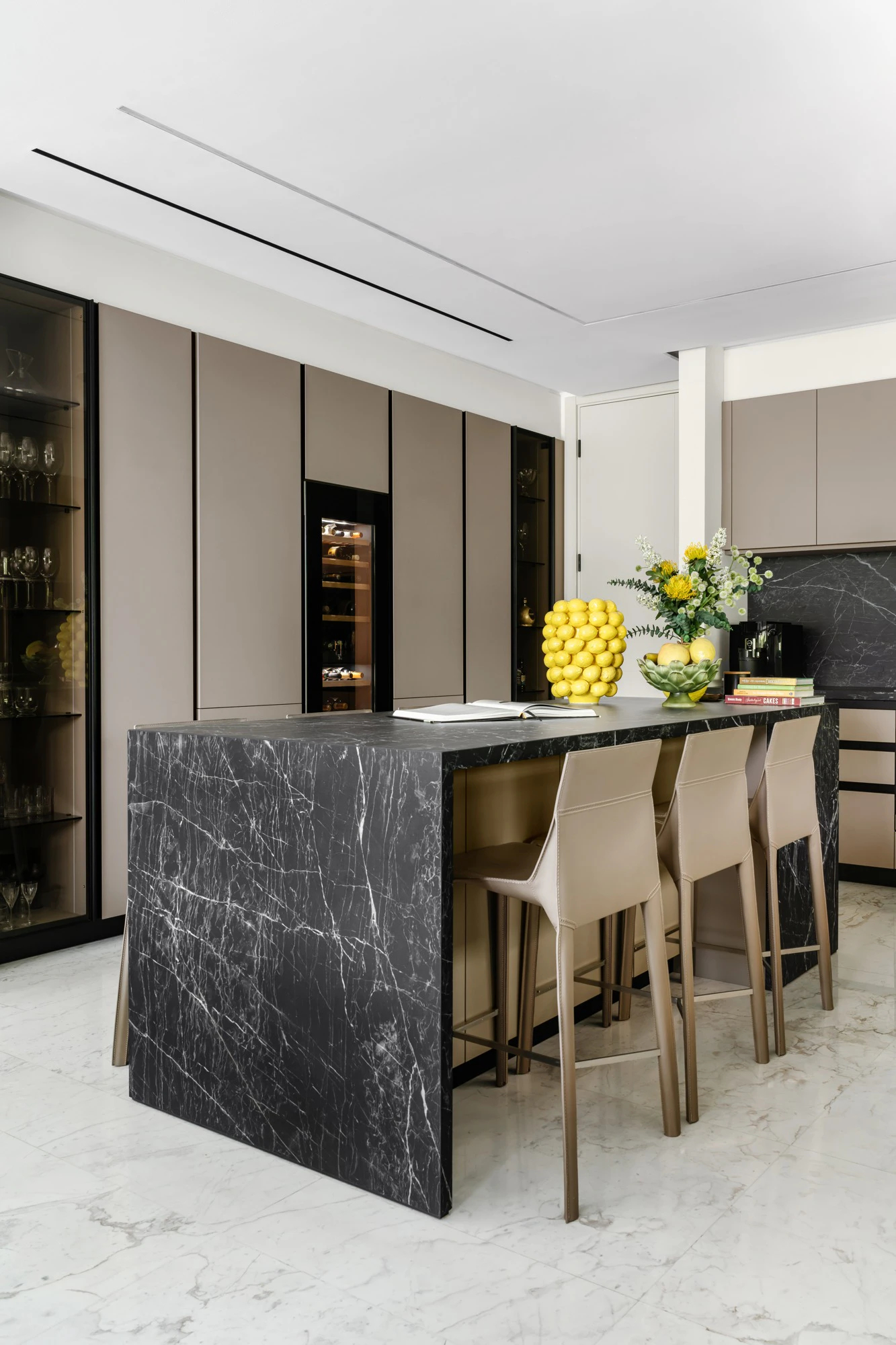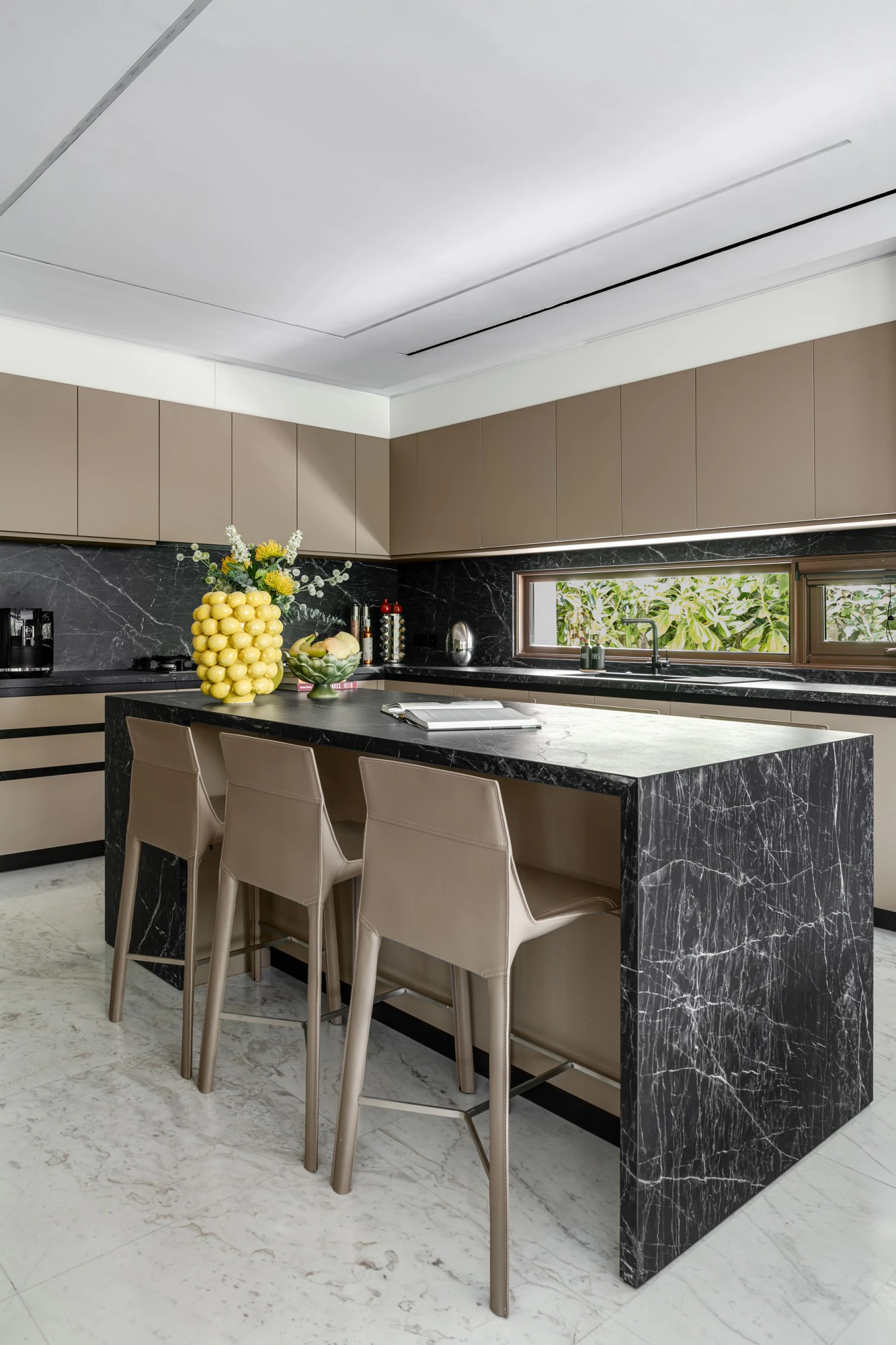 Indeed, just one glance at this space reveals that the island steals the show. With its captivating details of warm browns and oxidised whites blending into a deep black tone with a fine grid pattern, the piece brings refinement, texture, and sensory appeal to the space, infusing it with life.