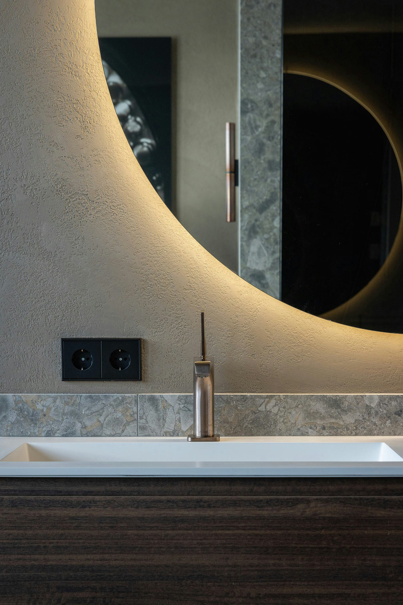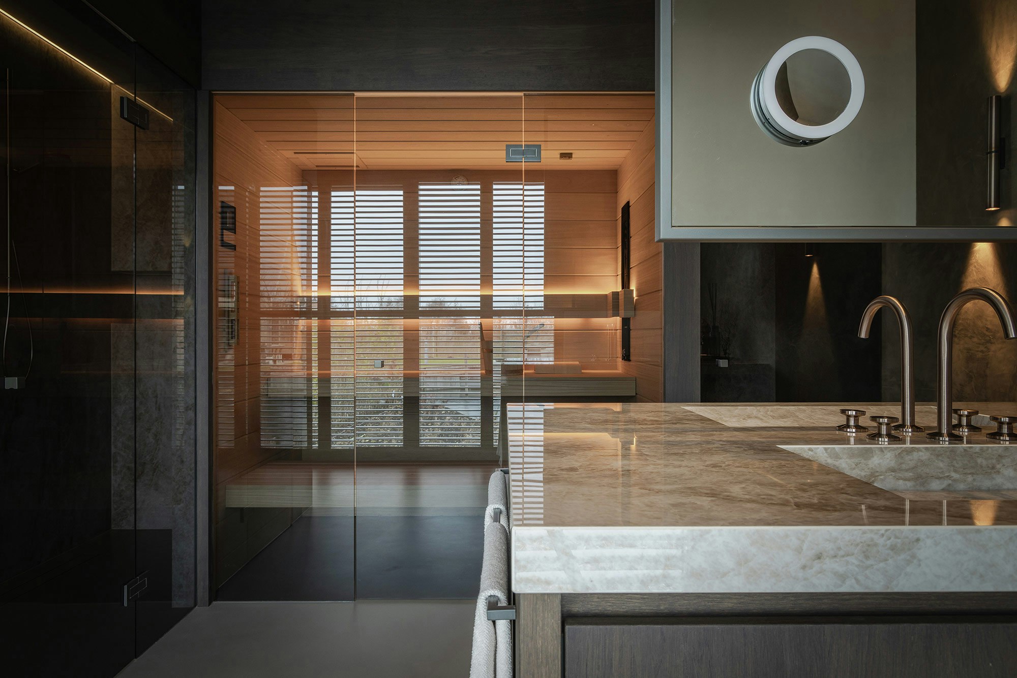 On the ground floor, there is a sliding door that provides access to a spacious walk-in closet, which in turn leads to a luxurious bedroom and bathroom. The open connection between the spaces is again clearly visible here. The bedroom has a custom-designed headboard, and the bathroom features a double shower and sauna. Once again, Dekton, in the color Taga, is the material of choice for the finish, while subtle lighting creates a serene and calm atmosphere. Details, such as the knobs on the glass doors of the bathroom, executed in the same color as the edge of the mirror, give a refined, unique appearance.