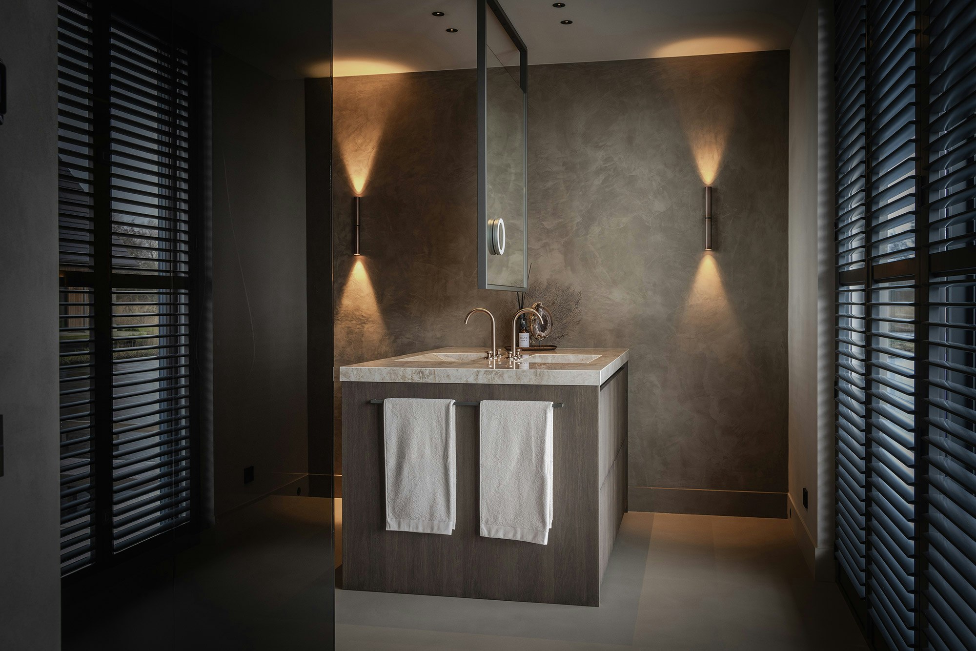 Studio MBC created a unique interior in this villa, where custom work, natural materials, and a well-thought-out lighting plan come together. The result is a chic home that exudes luxury and comfort, with a design that combines the robustness of natural materials with refined details and innovative lighting. This creates a serene oasis by the water.