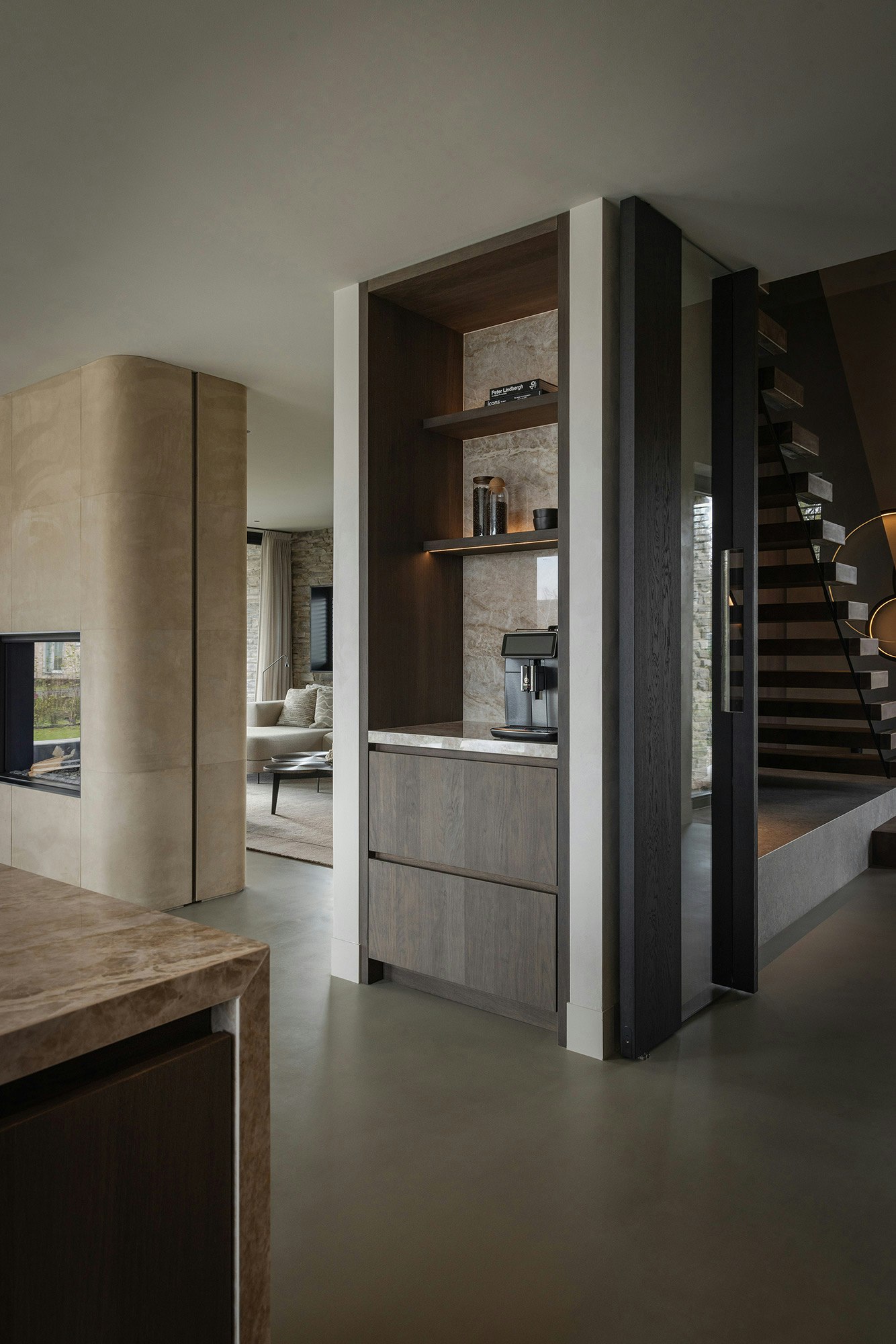 The layout of the villa is open and practical. The living room and kitchen are separate spaces, but the open connection between the two is beautifully enhanced by a see-through fireplace. The interior is largely furnished with custom-made furniture, using materials such as stained wood, leather, suede, and linen. In the kitchen, Dekton is used again as a countertop and backsplash, a versatile and practical material that perfectly matches the rest of the interior. Here, the color Taga is applied.
