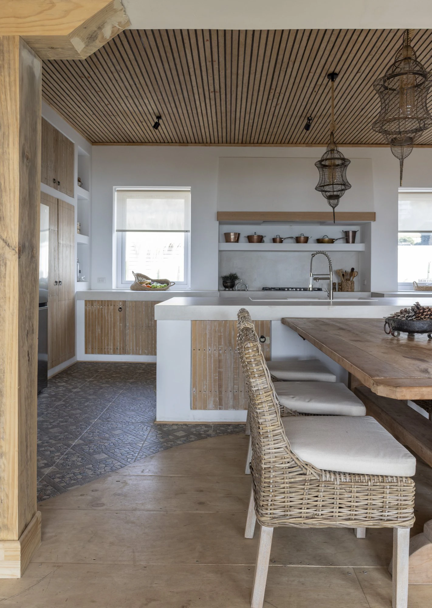 Among the most notable elements are the original ceiling clad with local wood, which adds warmth and authenticity, and the furniture doors made from the house's original shutters, carefully restored and reused. “This approach allowed the preservation of the place's memory, giving a new purpose to existing elements without altering the serene and timeless character of the home,” notes Aguirre Iduya.