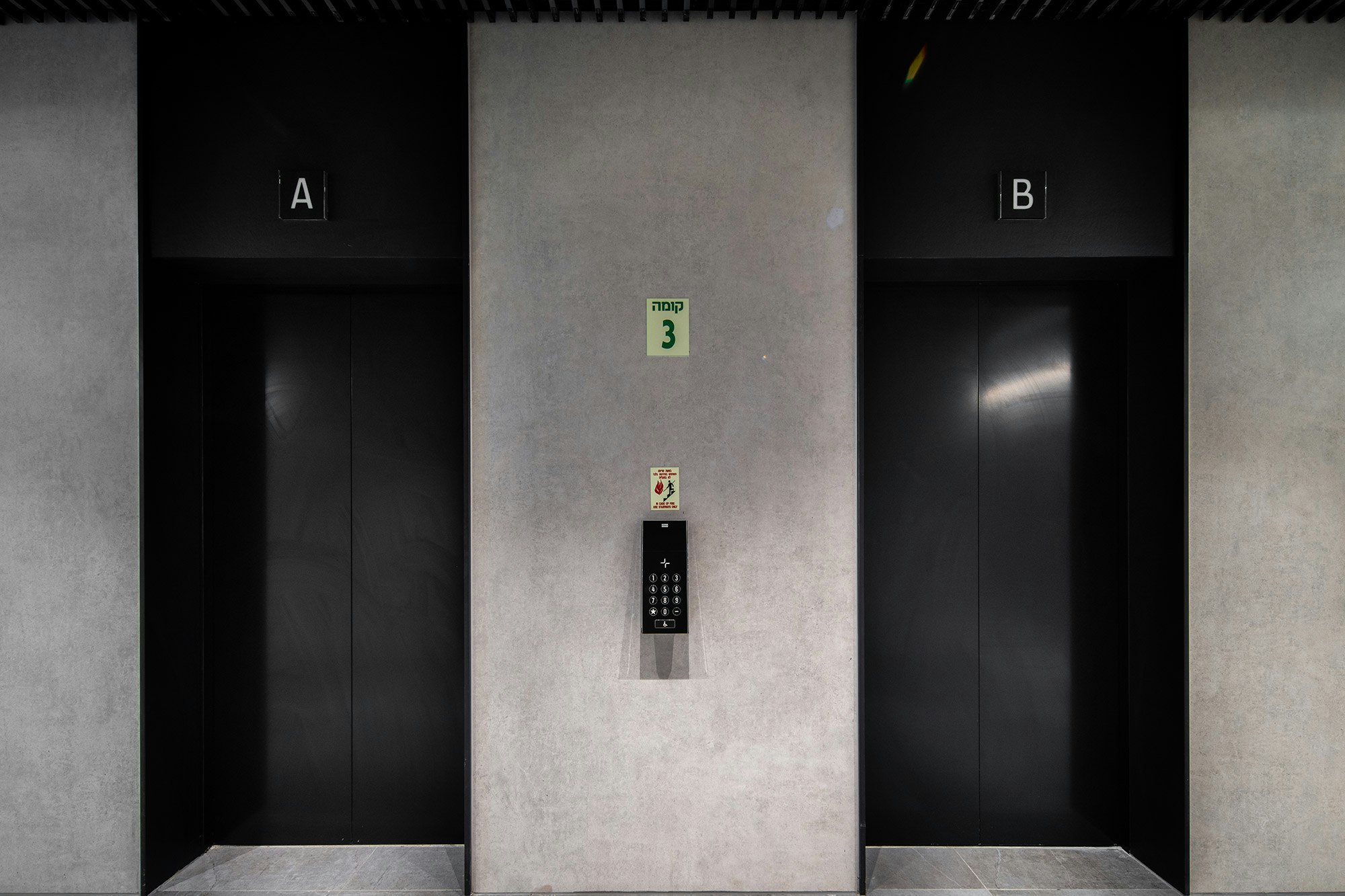 Orly Dekter faced the challenge of “creating a perfect harmony between inside and outside, using a material identity and a design concept that respects the architecture and landscape, rather than breaking with it. For example, a special roof was created to act as the lift lobby ceiling and wall cladding, with a shape that creates a plan view of the four buildings and the central plaza between them.”