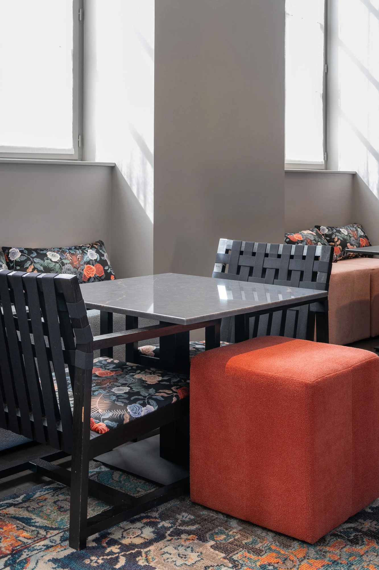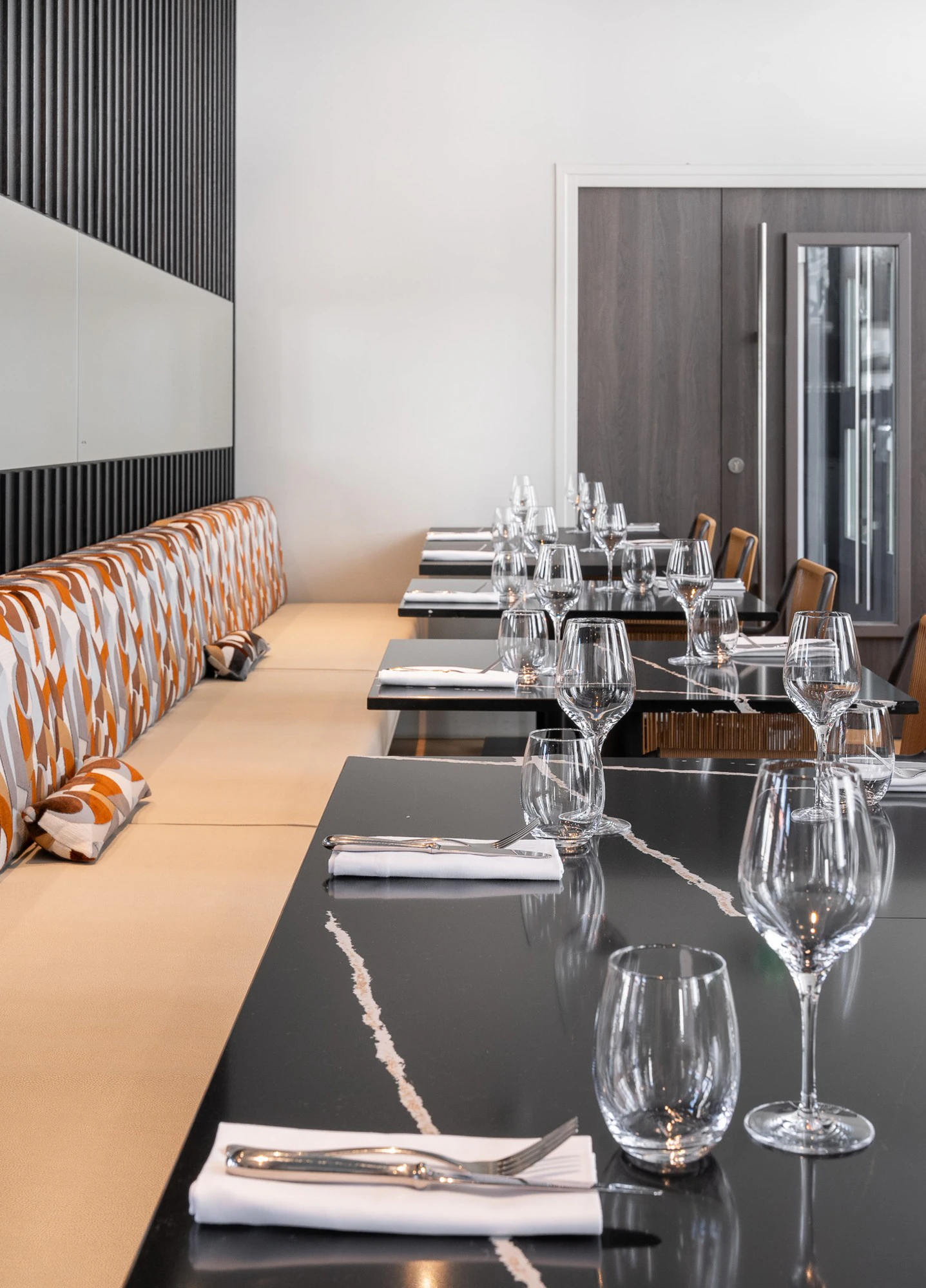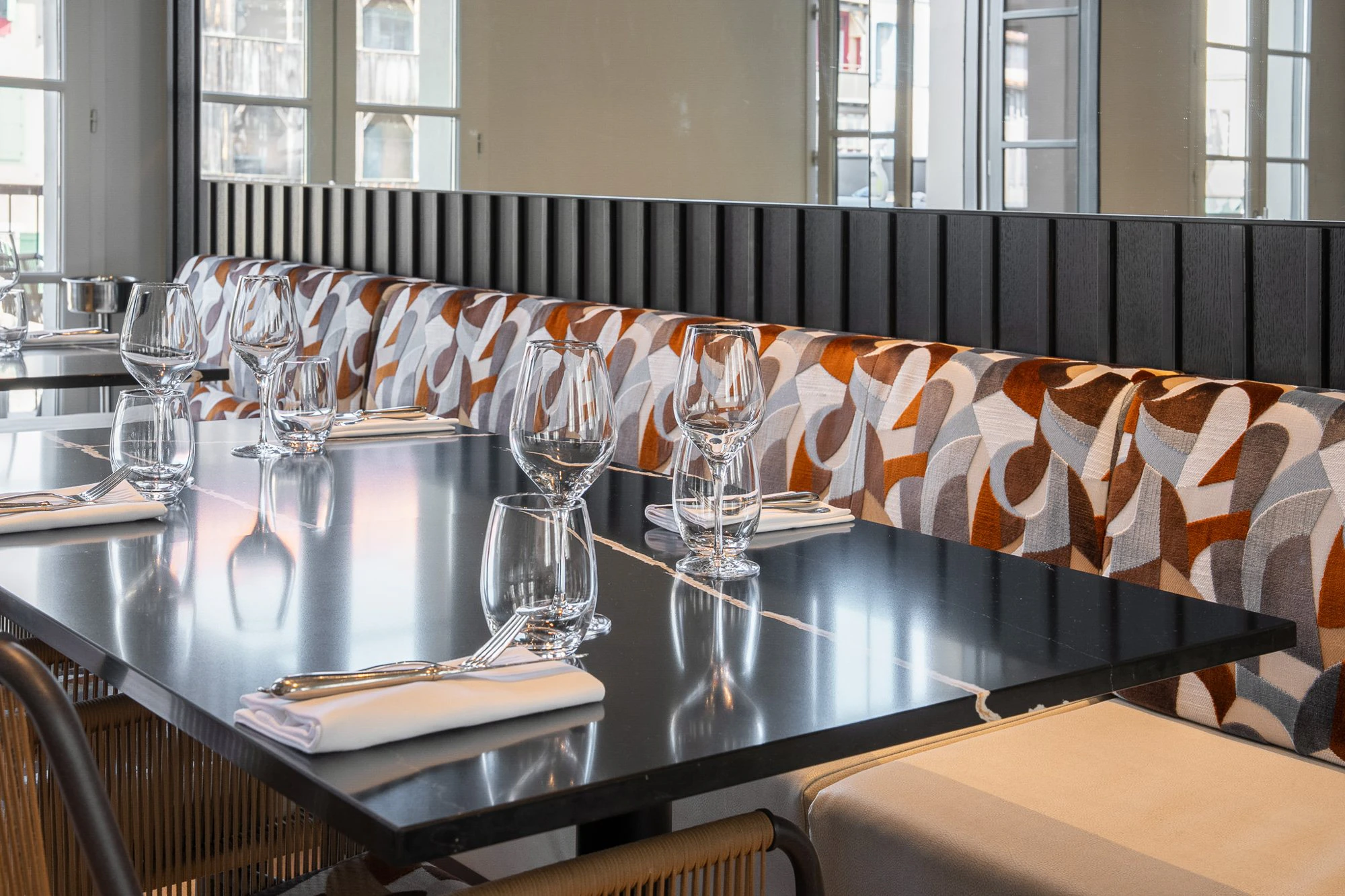 At the heart of this transformation, the restaurant has been conceived as a central gathering space, balancing conviviality, elegance and everyday use. Material choices play a defining role, not only for their visual presence but also for their ability to meet the technical demands of a hotel environment.