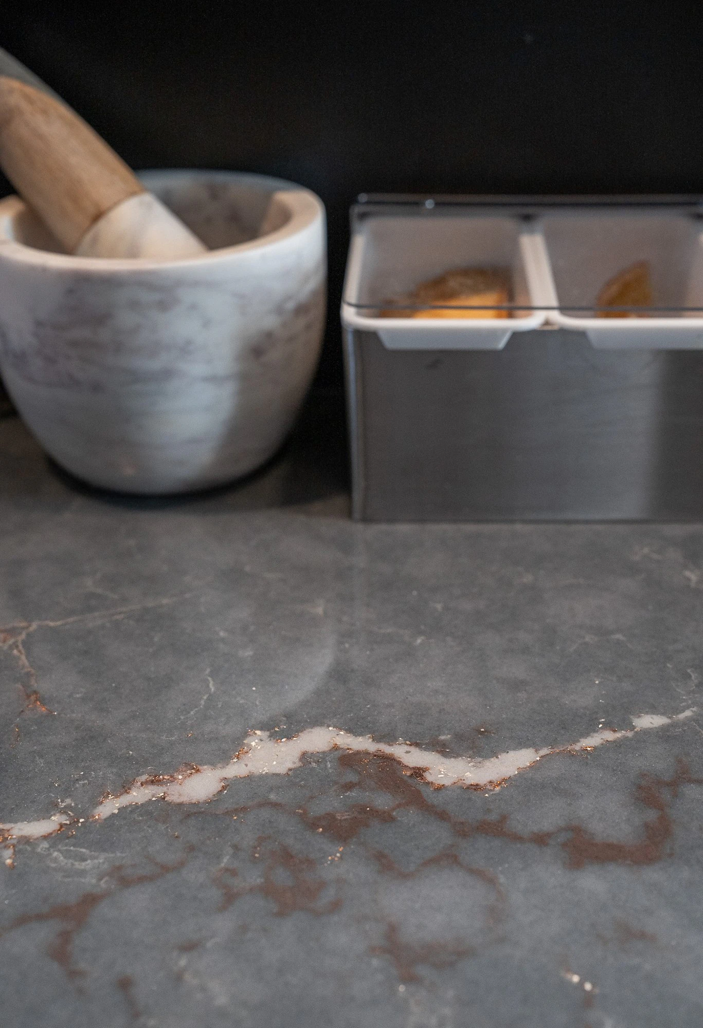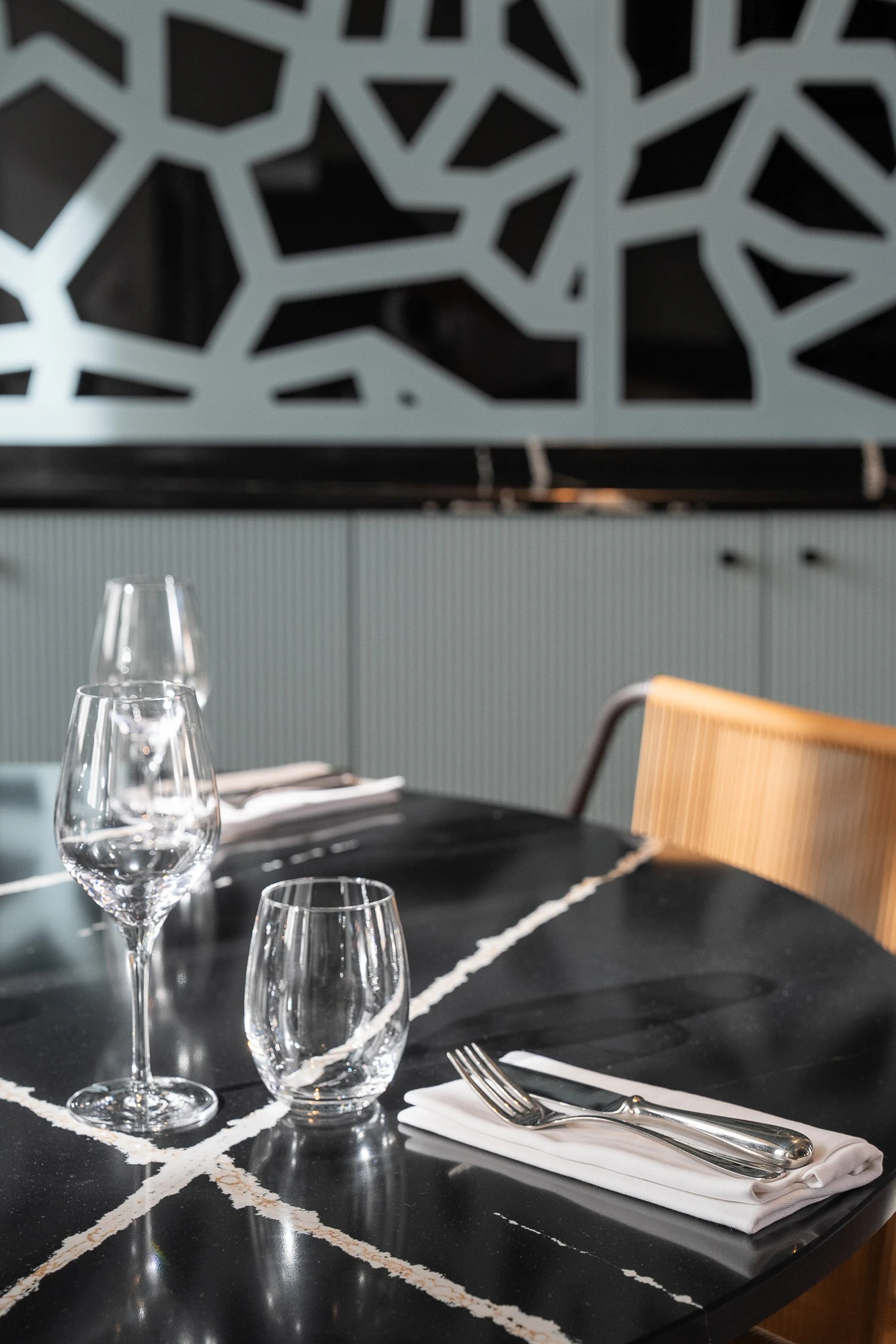 In the main dining room, the design language becomes more restrained and timeless. Table tops and the buffet counter are crafted in Silestone Eternal Noir, a deep black surface subtly veined, bringing structure and elegance to the space. The material creates a strong yet understated presence, reinforcing the clarity of the volumes and the overall coherence of the project.