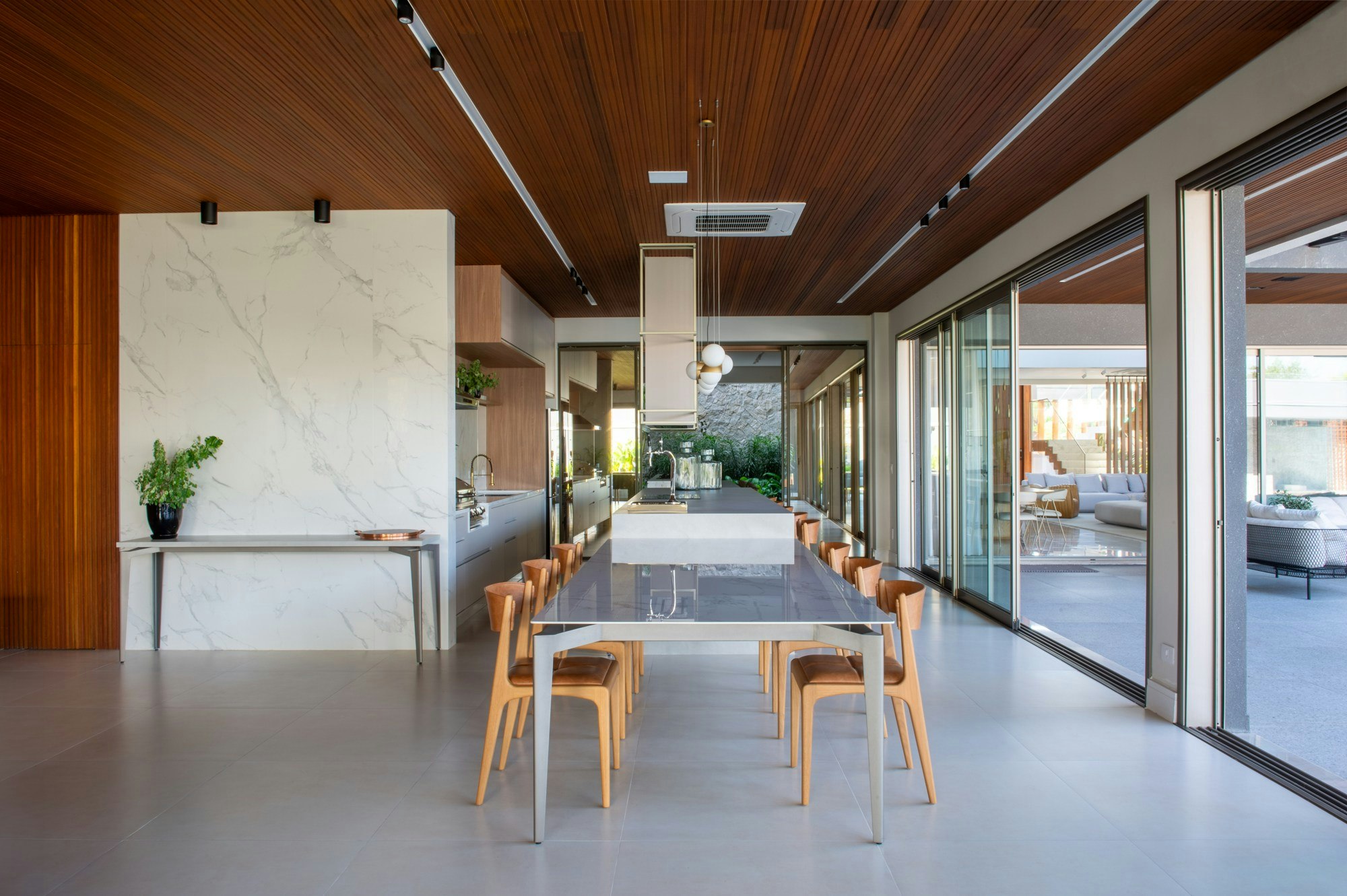 Dekton Natura brought the beauty of marble in its most natural form, with soft grey veins standing out on a classic white surface. Applied to the walls of the kitchen and gourmet area, its polished and glossy finish subtly reflects light, creating a bright and luminous atmosphere.