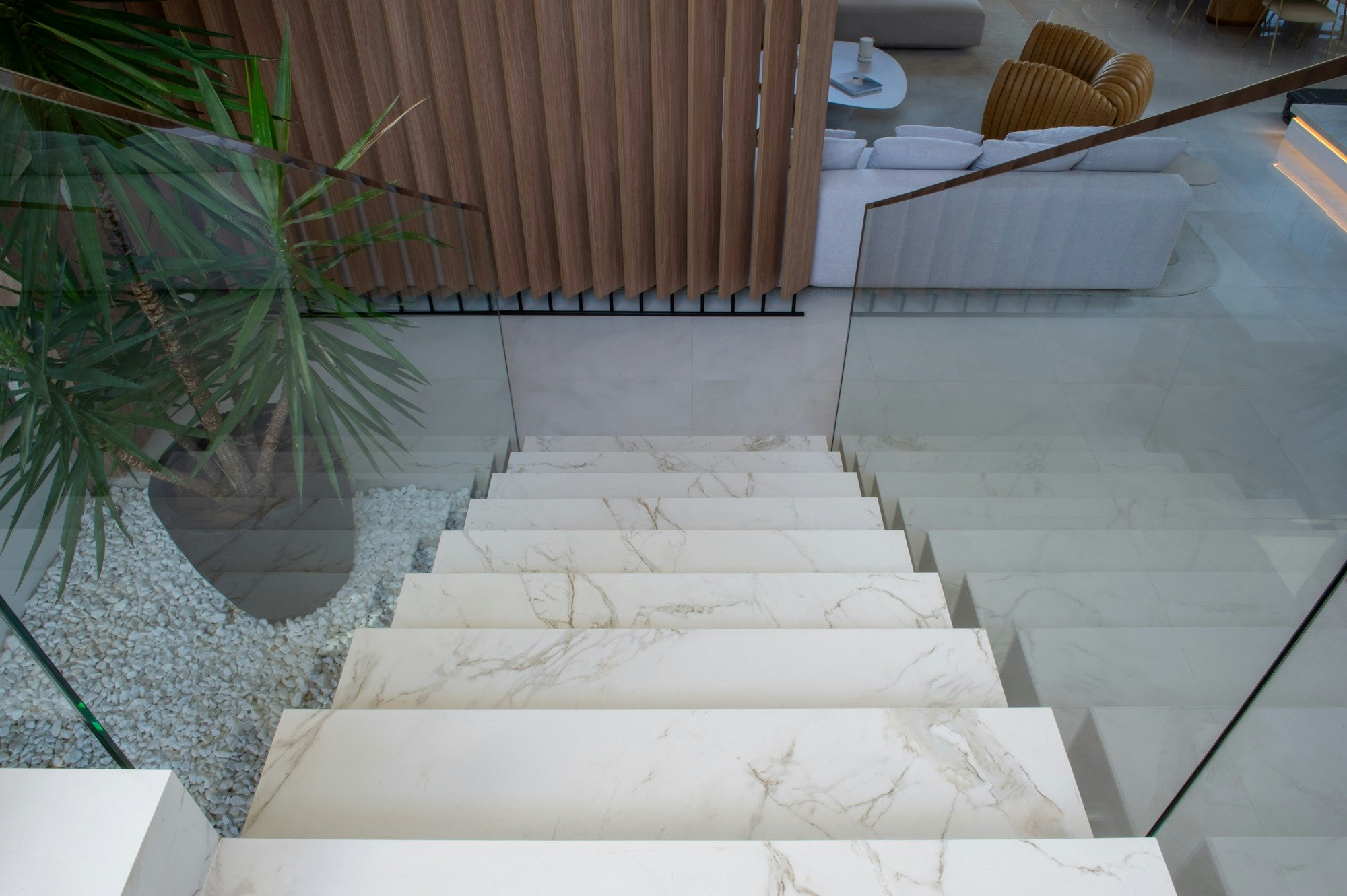 Meanwhile, Dekton Entzo, inspired by golden Calacatta marble, was used on the staircases, living room walls, and kitchen worktop. Its golden veins create an elegant and welcoming atmosphere that draws attention without being overpowering.