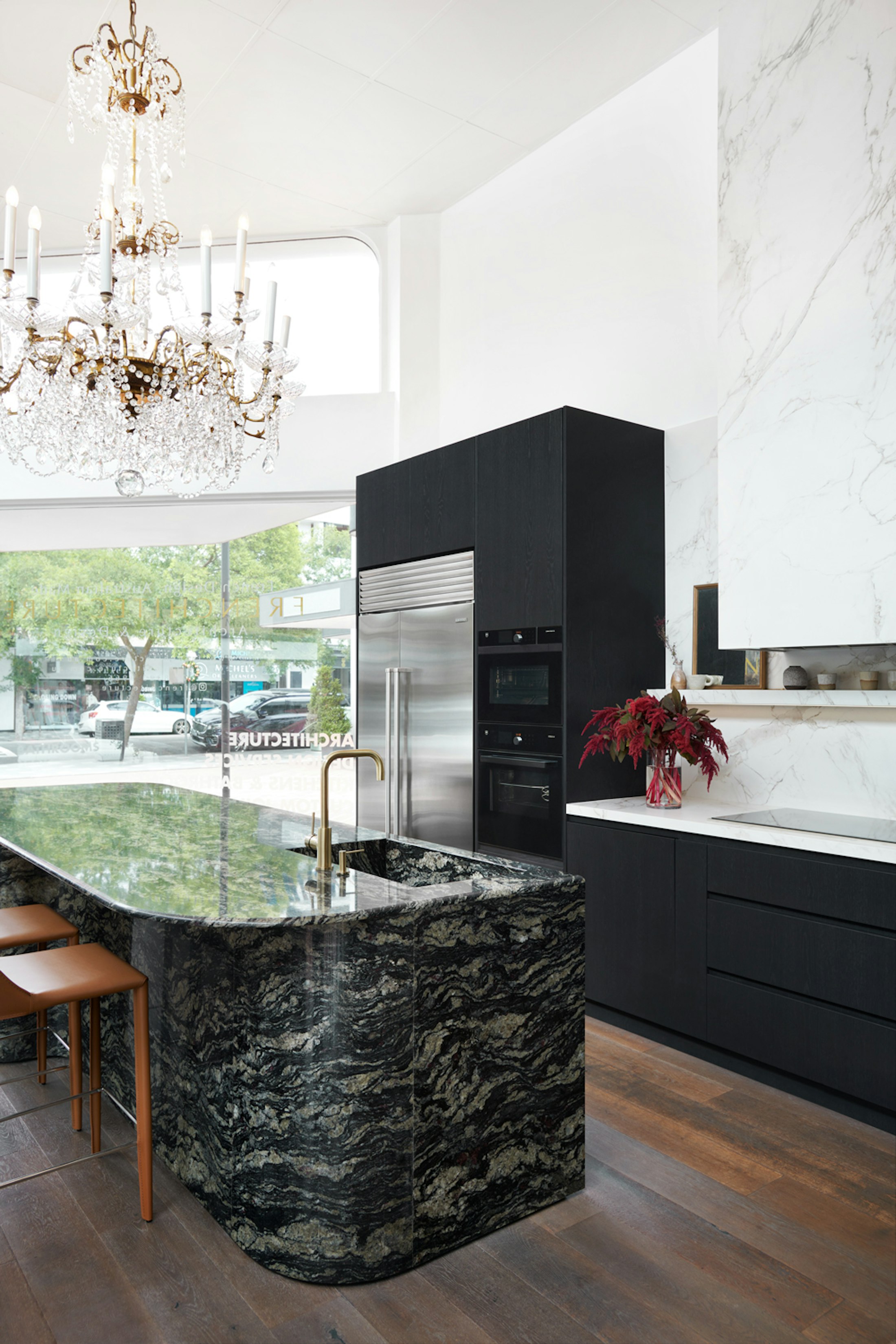 The deep black background of this Brazilian granite is crossed by light, almost crystalline veins, creating a whimsical design that enhances the unique beauty of this natural stone.