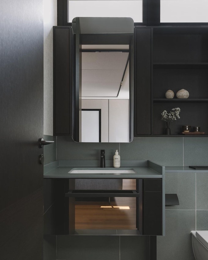 This modern bathroom combines dark tones with a touch of blue for a bold luxury look.