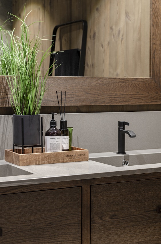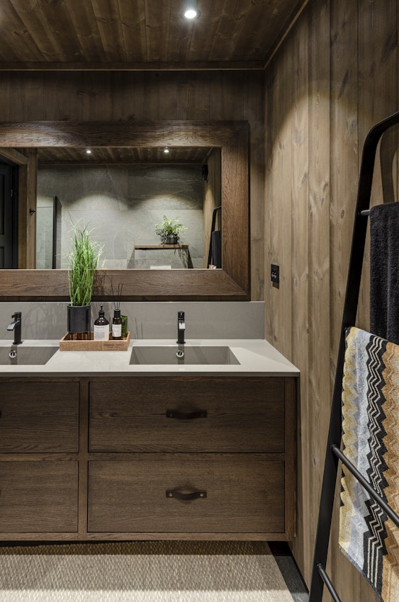 Benkeplate til baderom på hytte med integrert Silestone-vask, og sprutekant ovenfor.