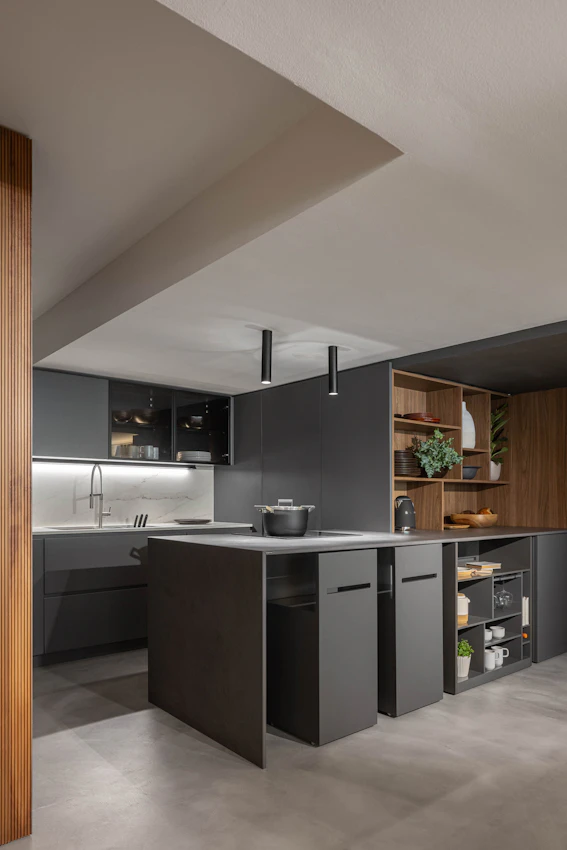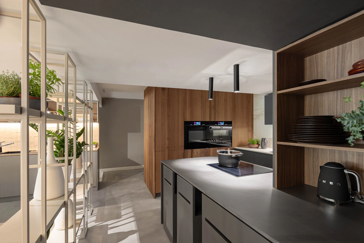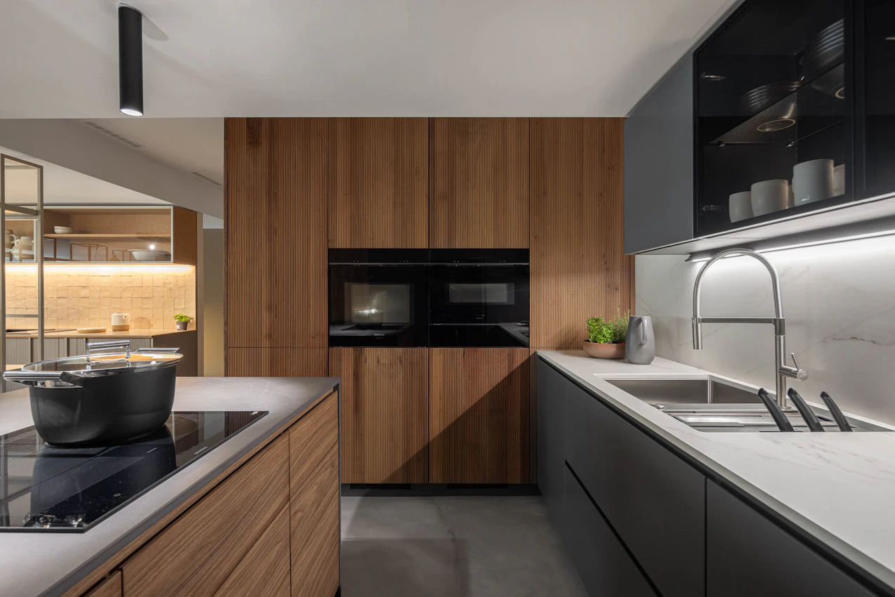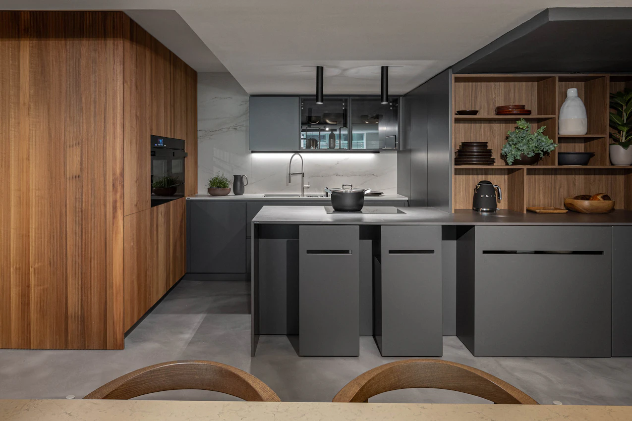 Cozinha Fabri com portas no modelo Matosinhos lacadas a cinza-feijão mate, combinadas com portas no modelo Douro ripadas em nogueira - com tampo da bancada em Dekton Rem e tampo da ilha em Dekton Micron.