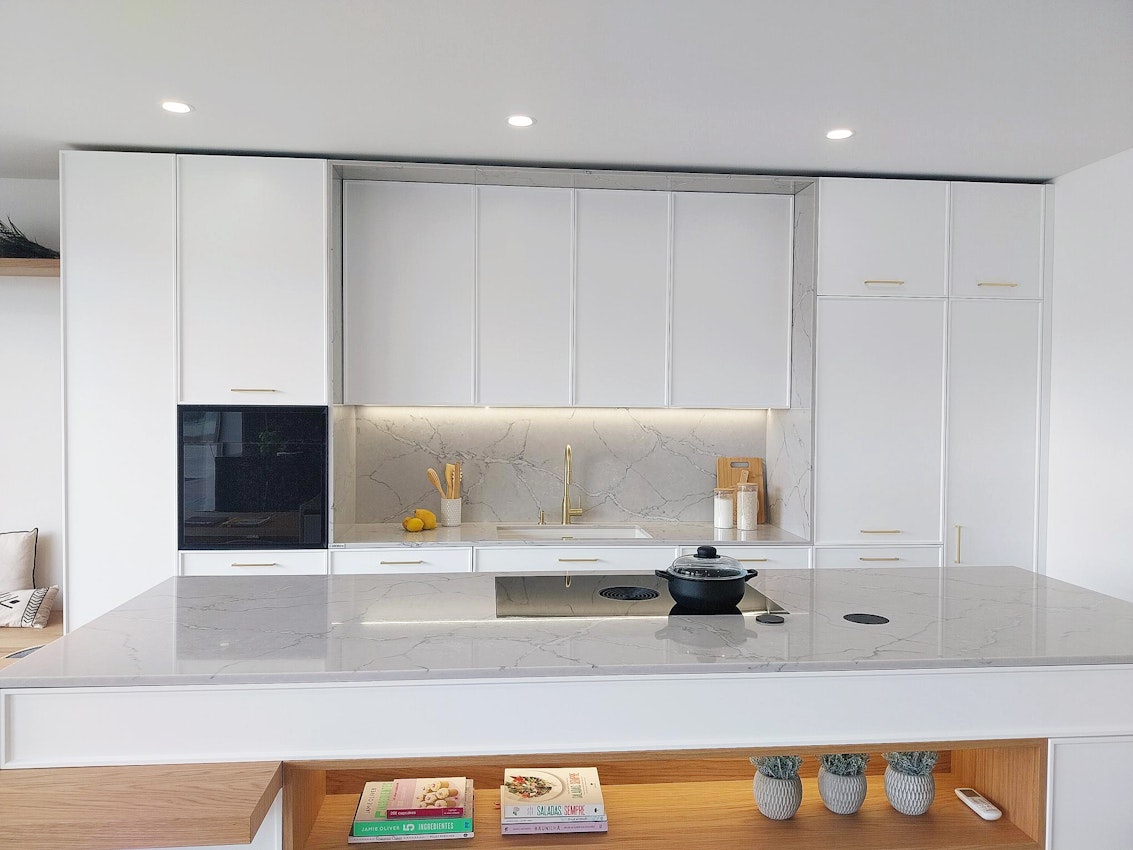 Cozinha com tampos, ilhargas, painel mural em Silestone Victorian Silver 20mm