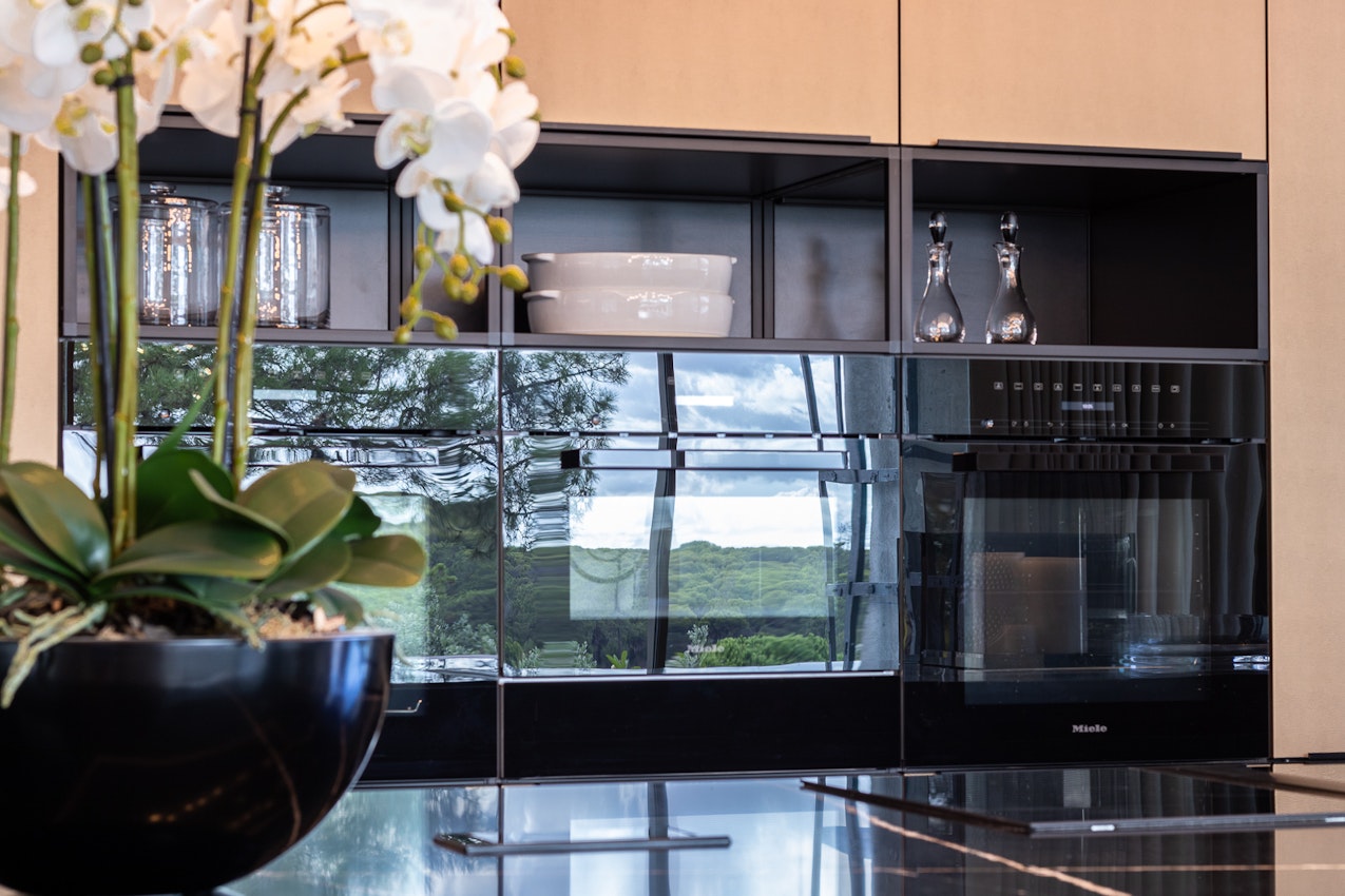 Uma cozinha moderna que exala glamour é o epítome do luxo e da sofisticação. Esta cozinha em particular apresenta um esquema de cores preto e dourado que dá um toque de elegância e opulência ao espaço.