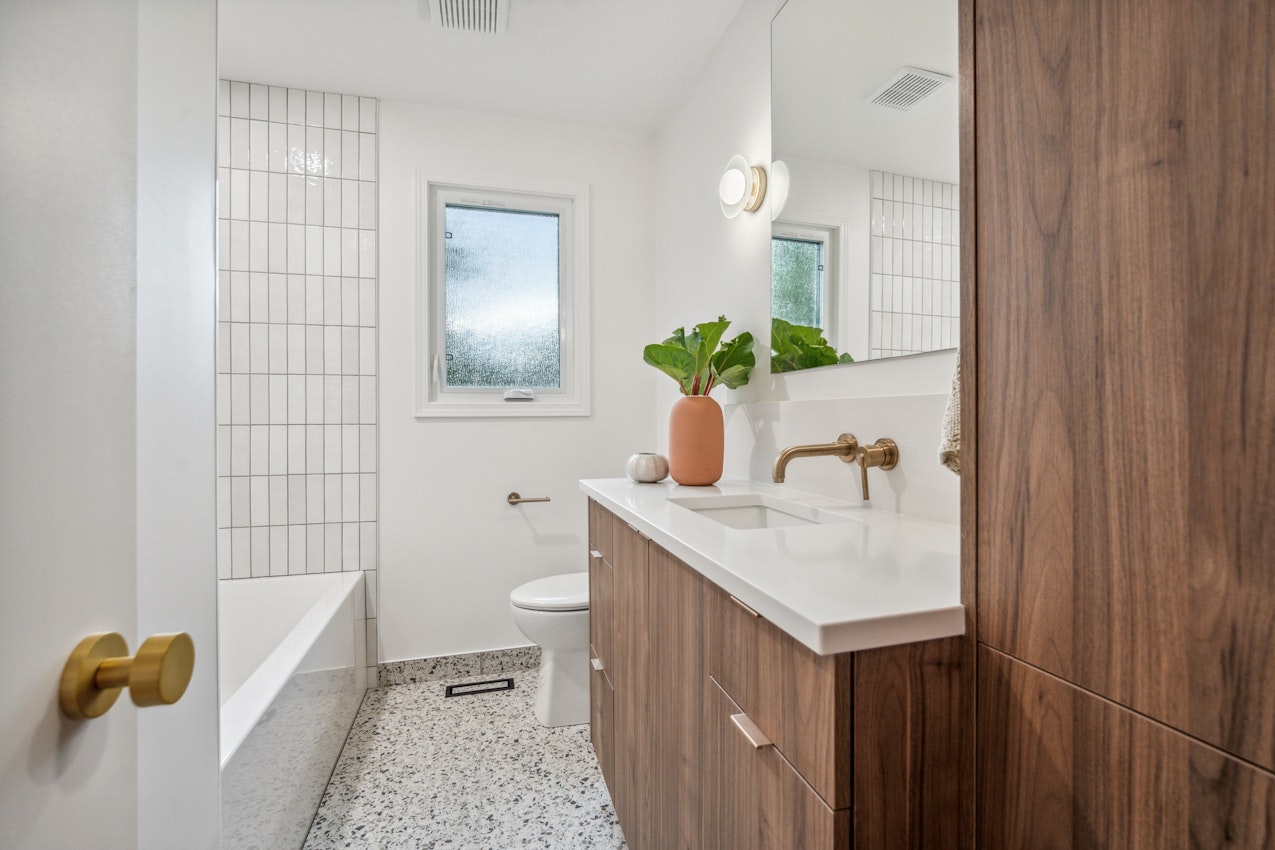 The Strathearn Project is a nod to mid-century design with a fresh, modern twist. By opening up the layout and incorporating walnut accents, terrazzo flooring, and sage green tile, we transformed the kitchen and bathrooms into spaces that are both functional and full of character. This renovation blends timeless elements with modern upgrades, breathing new life into a classic home.