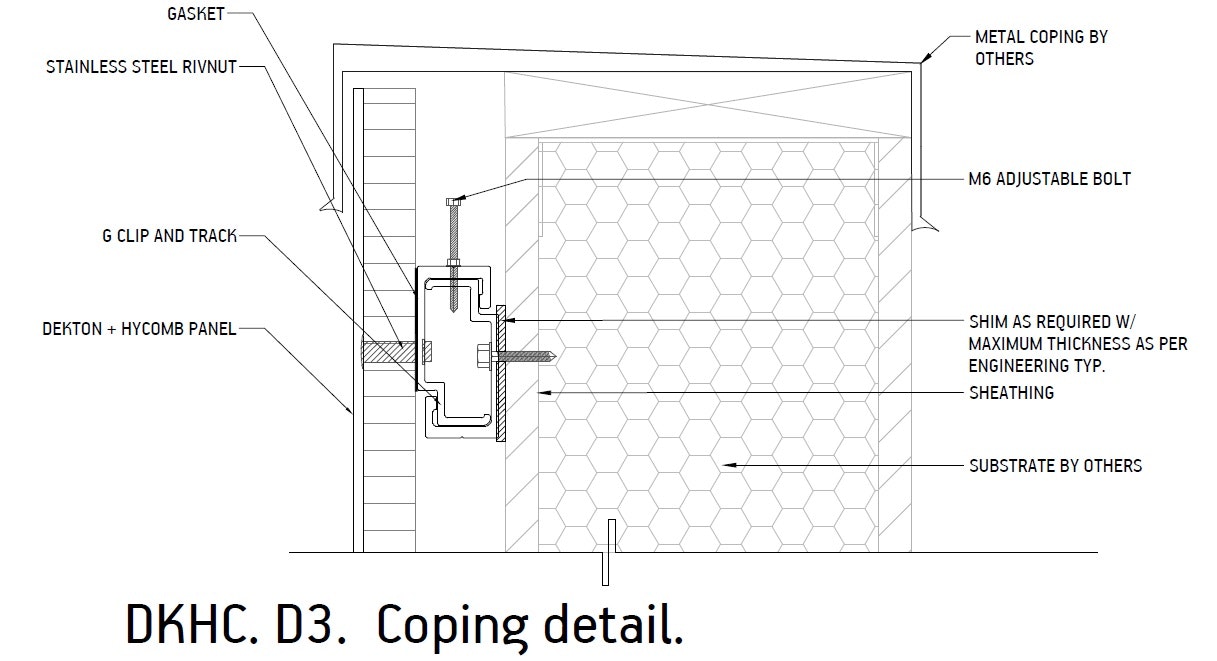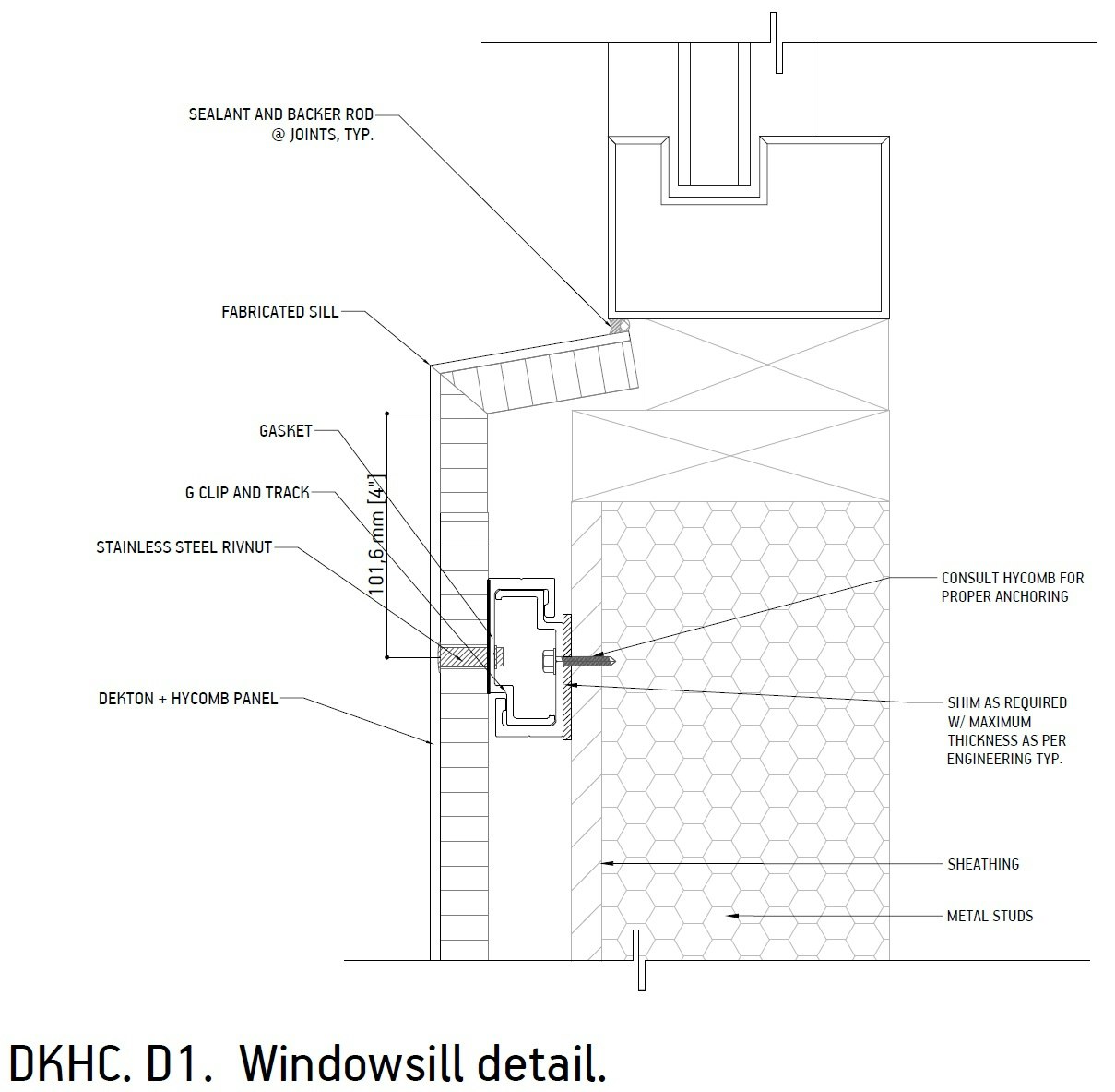 Panel composed of Dekton® veneer on aluminum honeycomb backing panel. The panel is presented in several thicknesses and can be manufactured with fiberglass or aluminum back sheets, bonded to an aluminum honeycomb core.