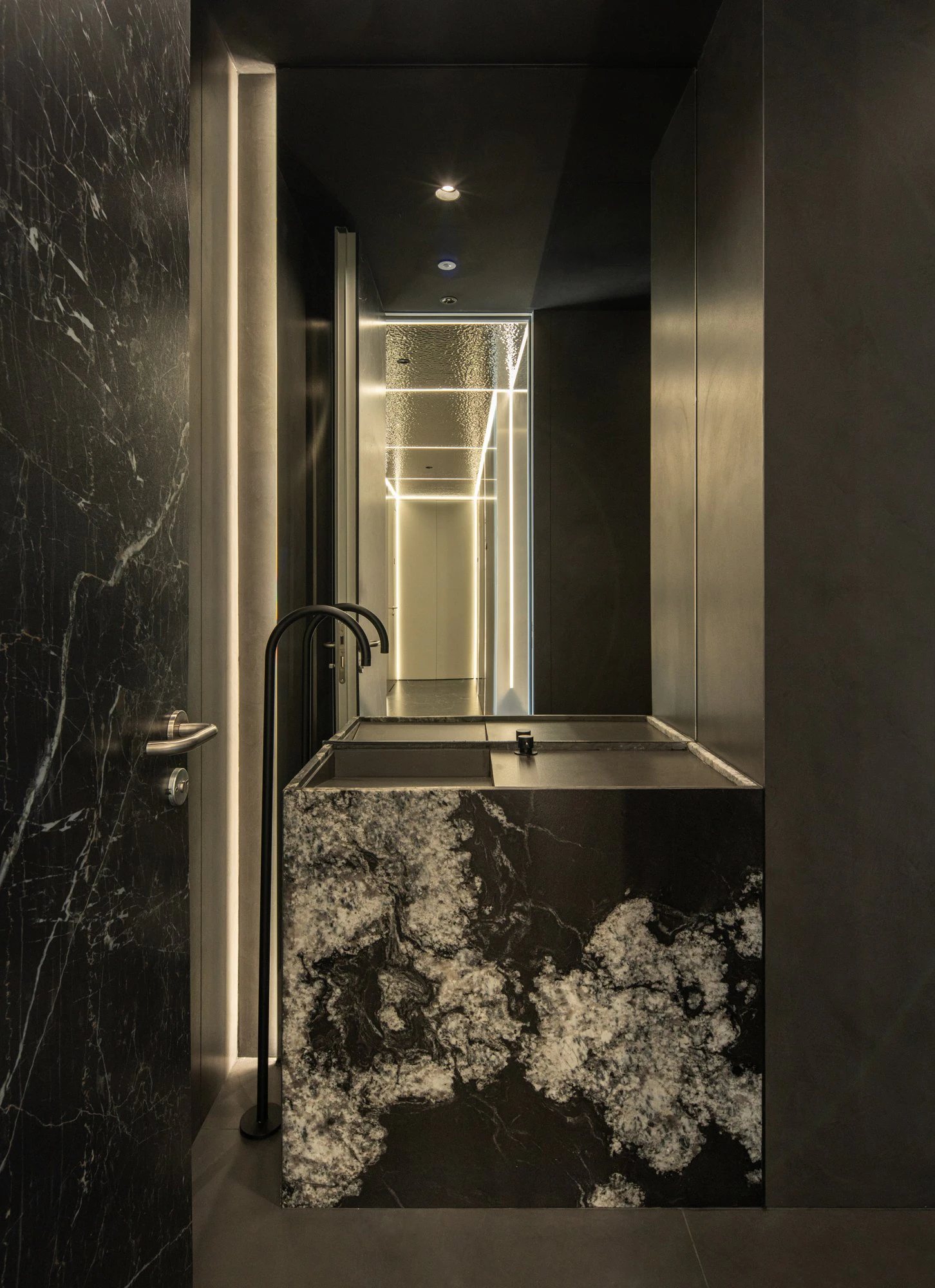 “In the reception counter and the washbasin unit, marble from the Sensa series has been used, in both cases in pieces specifically designed by the studio. With these, we aimed to bring nobility, elegance, and greater presence to the space,” explain the architects about the application of this Brazilian granite with stain-resistant protection. Dekton Micron, with its dark tone and slight chromatic gradations, has also been used in the bathroom cladding.